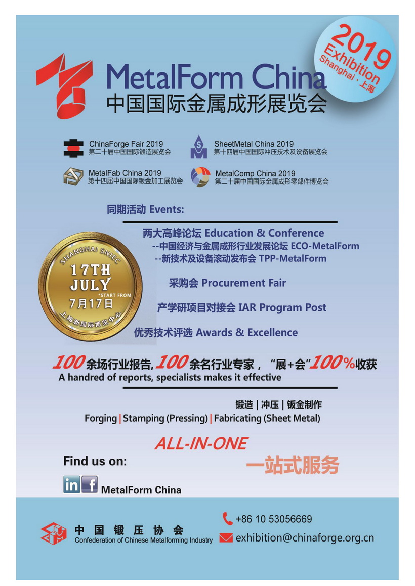 中國鍛壓協(xié)會的品牌展覽會―中國國際金屬成形展單年回到上海舉辦,主題是:“新時代、新技術(shù)、新未來”,誠邀貴公司參展!該展包含四個主題展: