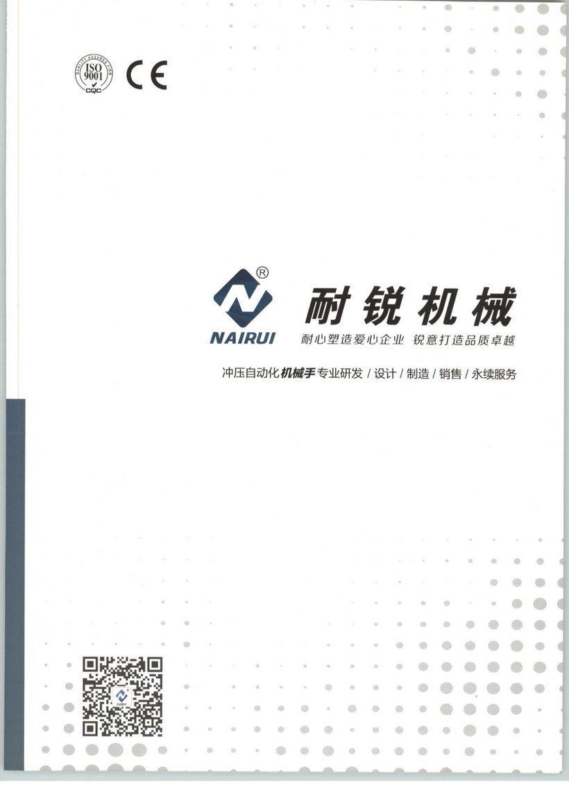 東莞市耐銳機械有限公司成立于2003年,公司廠房占地面積二十畝,擁有員工110余人,其中專業(yè)設(shè)計團隊15人,半數(shù)擁有本科及以上學(xué)歷。是一家專業(yè)致力于沖床周邊自動化設(shè)備的研發(fā)、生產(chǎn)、銷售企業(yè)。公司秉承著“耐心塑造愛心企業(yè),銳意打造卓越品質(zhì)”的企業(yè)宗旨和“篤守誠信,銳意進(jìn)取,務(wù)實創(chuàng)新,專業(yè)服務(wù)”的企業(yè)精神,先進(jìn)的生產(chǎn)工藝,高效的管理控制,完善的品質(zhì)體系,周到完備的售后服務(wù),設(shè)計生產(chǎn)提供高速沖床周邊設(shè)備,品質(zhì)卓越,性能穩(wěn)定。通過多年的發(fā)展,公司已具備了專業(yè)化,規(guī)模化的生產(chǎn)能力。主要產(chǎn)品:二次元、三次元機械手、連桿機械手、獨立機械手、模內(nèi)機械手、拆垛機、高速滾輪送料機、新型高速夾式送料機、NCF滾輪送料機、精密整平機、三合一料架整平送料機、皮帶式高速齒輪更換式送料機及其它沖床周邊自動化設(shè)備。