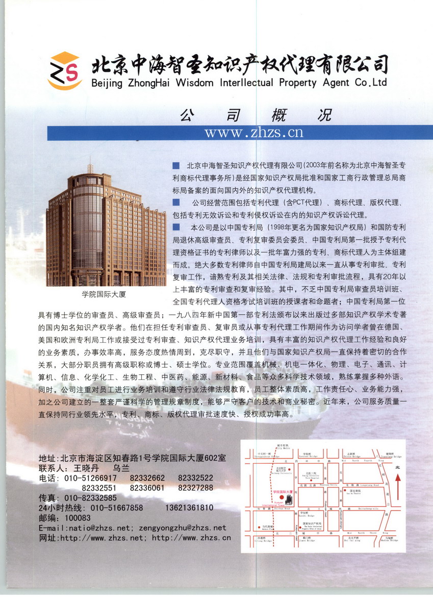 北京中海智圣知識產(chǎn)權(quán)代理有限公司是經(jīng)國家知識產(chǎn)權(quán)局批準(zhǔn)和國家工商行政管理總局商標(biāo)局備案,成立于2003年面向國內(nèi)外的知識產(chǎn)權(quán)涉外代理機構(gòu)。公司董事長兼總經(jīng)理曾永珠博士,國內(nèi)知名知識產(chǎn)權(quán)專家,在中國專利局(現(xiàn)為國家知識產(chǎn)權(quán)局)和國防專利局工作20多年,先后擔(dān)任專利審查員、高級專利審查員、專利復(fù)審委員會委員、國防專利局局長等職務(wù),是中國專利局和國防專利局第一位具有博士學(xué)歷與學(xué)位的專利審查員、高級專利審查員。自1985年以來,出版《實用專利全書》等專利領(lǐng)域?qū)W術(shù)專著6部,發(fā)表有關(guān)知識產(chǎn)權(quán)等方面學(xué)術(shù)論文100余篇。曾博士是近年來國內(nèi)重大知識產(chǎn)權(quán)訴訟要案之一、舉國關(guān)注的“天下第一刀”專利權(quán)人在北京市高級人民法院終判決審理中委托的律師團首席發(fā)言人,為專利權(quán)人的專利在國家知識產(chǎn)權(quán)局復(fù)審委員會和北京市第一中級人民法院被判決無效的頗為不利的情況下贏得了高院終審勝訴,在國內(nèi)產(chǎn)生重大影響。近年來,公司代理的諸多知識產(chǎn)權(quán)糾紛案件中,以曾博士為首知識產(chǎn)權(quán)專家、專利律師,在訴訟中表現(xiàn)出的深厚的法律功底、寬廣的專業(yè)技術(shù)知識和雄辯的口才受到國內(nèi)外委托人的贊譽。