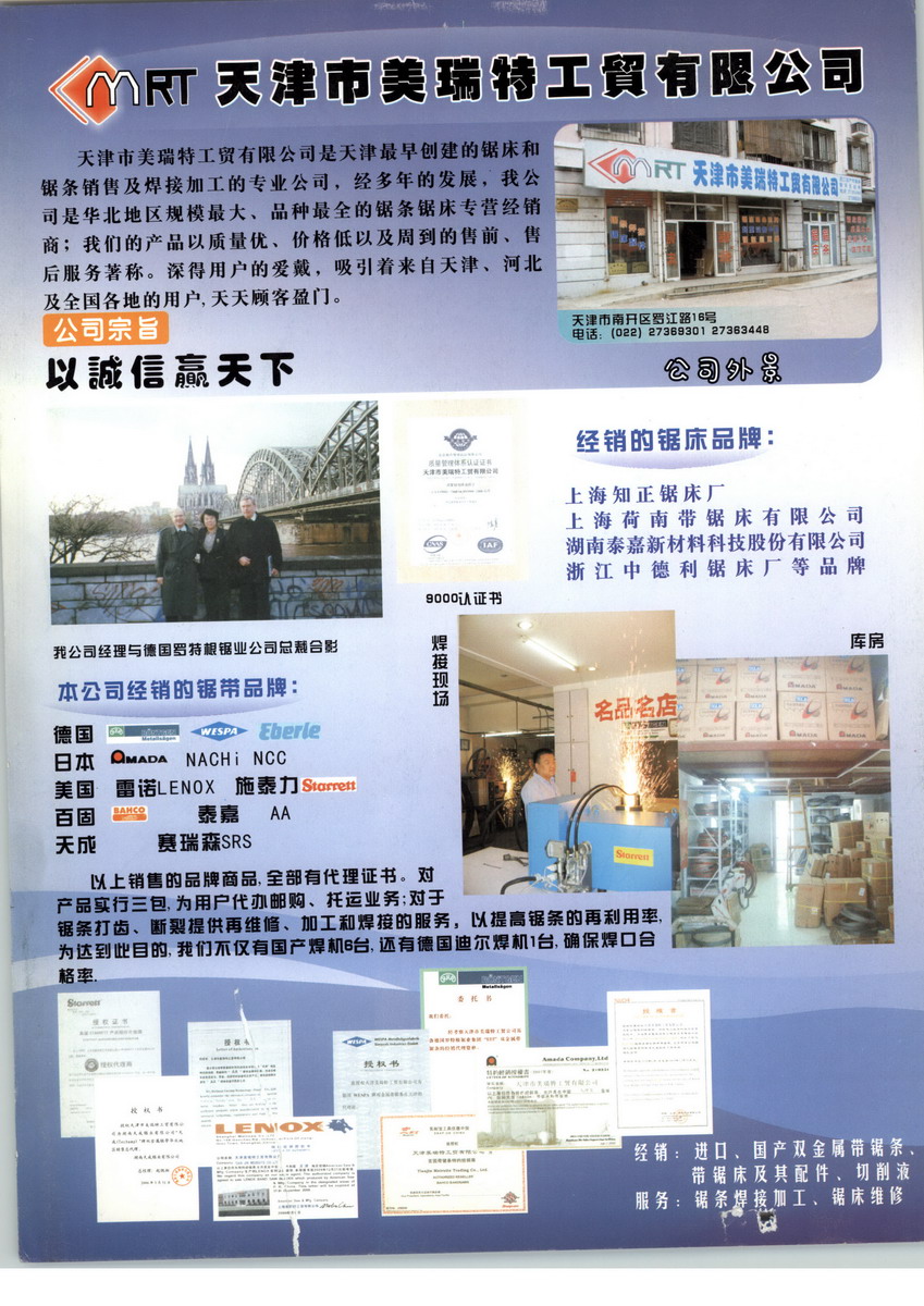 天津市美瑞特工貿(mào)有限公司是天津最早創(chuàng)建的鋸床和鋸條焊接加工的專業(yè)公司,經(jīng)多年的發(fā)展,我公司是目前本市規(guī)模最大、品種最全的鋸條鋸床經(jīng)銷商;我們的產(chǎn)品以質(zhì)量優(yōu)、價格低以及周到的售前、售后服務(wù)著稱。深得用戶的愛戴,吸引著來自天津、河北及全國其它地區(qū)的用戶。