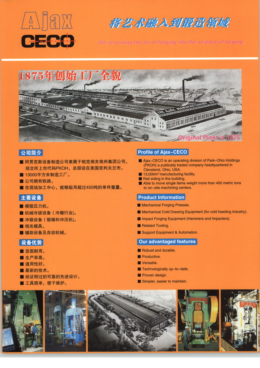 阿賈克斯設備制造公司隸屬于帕克俄亥俄州集團公司,紐交所上市代碼PKOH,總部設在美國克利夫蘭市。13000平方米制造工廠,公司擁有鐵路、在現(xiàn)場加工中心,能夠起吊超過40噸的單件重量。