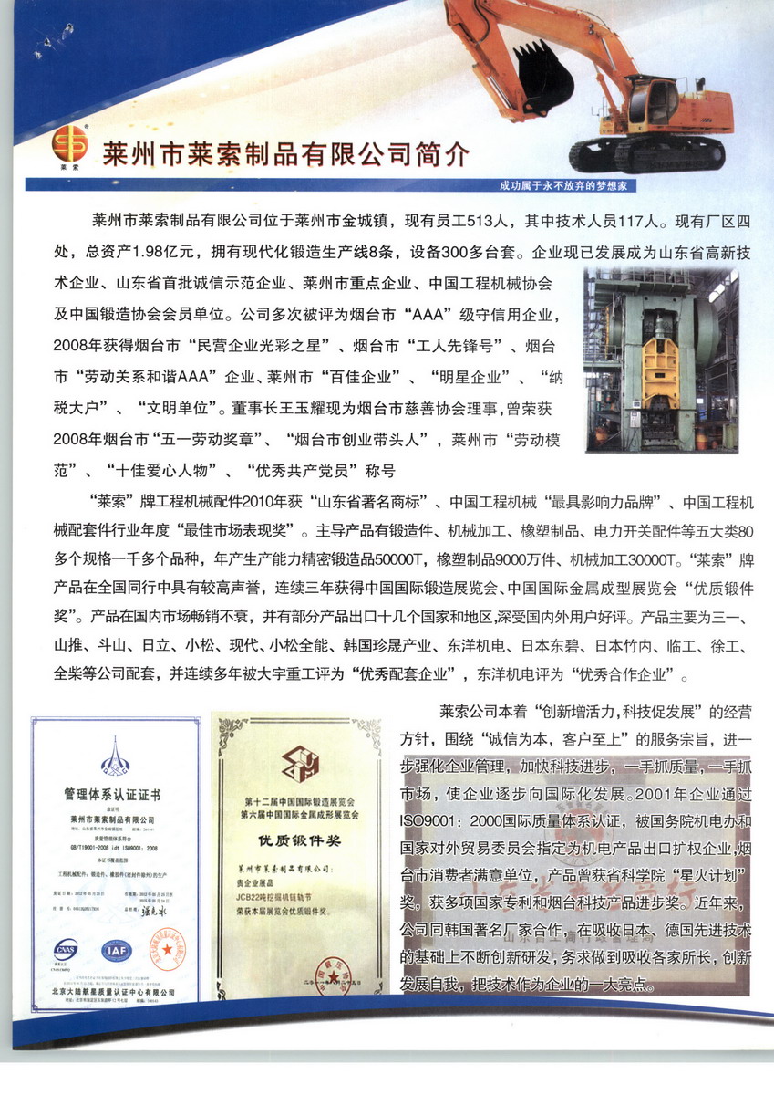 產(chǎn)品主要為日本東碧、小松、日立、竹內(nèi)、神鋼、韓國(guó)斗山、現(xiàn)代、珍晟、東洋、意大利IDM、伯爾克、美國(guó)卡特和三一重機(jī)、山推、徐工、龍工、南車等公司配套。2001年企業(yè)通過(guò)ISO9001:2000國(guó)際質(zhì)量體系認(rèn)證,鍛造技術(shù)和調(diào)質(zhì)技術(shù)通過(guò)日立建機(jī)認(rèn)證。公司發(fā)揮自身鍛造技術(shù)優(yōu)勢(shì),對(duì)工程機(jī)械用精密零部件實(shí)現(xiàn)了國(guó)產(chǎn)化供應(yīng),連續(xù)多年被大宇重工評(píng)為優(yōu)秀配套企業(yè)、被東洋機(jī)電評(píng)為優(yōu)秀合作企業(yè)、三一重機(jī)、山推股份評(píng)為合格供方.