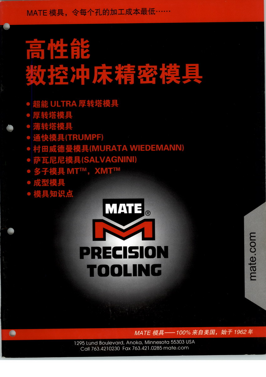 Mate Precision Tooling始建于1962年,總部位于美國明尼蘇達(dá)州的阿諾卡市,是一家為Amada, Euromac, LVD-Strippit, Murata Wiedemann, PrimaPower and Trumpf機(jī)床生產(chǎn)商提供原廠新機(jī)包和數(shù)控沖床模具備件的領(lǐng)先制造商。全球目前擁有兩個制造基地,分別位于美國和德國。在過去的五十年里,MATE已經(jīng)在產(chǎn)品的品質(zhì),價格,交期和服務(wù)上占據(jù)了行業(yè)領(lǐng)導(dǎo)地位。美特的產(chǎn)品和服務(wù)的理念只有一樣,那就是幫助客戶生產(chǎn)出能更有效和優(yōu)質(zhì)產(chǎn)品。