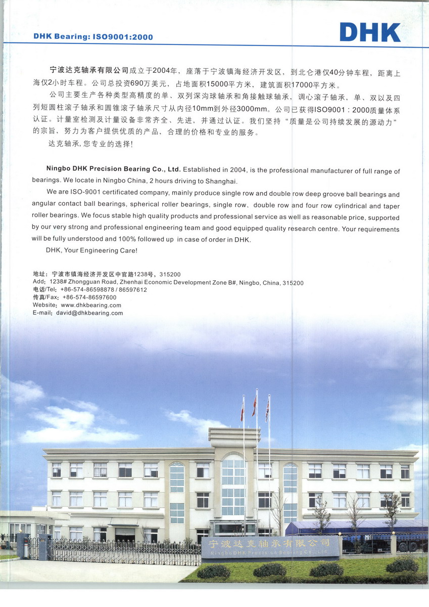 寧波達(dá)克軸承有限公司(DHK)是一家專業(yè)從事軸承研發(fā)、生產(chǎn)和銷售的企業(yè),位于交通便利的寧波鎮(zhèn)海經(jīng)濟(jì)開發(fā)區(qū)。公司自成立至今,十余年來,一直將“技術(shù)”、“品質(zhì)”和“服務(wù)”作為企業(yè)發(fā)展之本,為世界級重工企業(yè)長期提供質(zhì)量可靠的產(chǎn)品和專業(yè)定制化的服務(wù),獲得了眾多海內(nèi)外一流企業(yè)的滿意和好評。DHK主要生產(chǎn)圓柱滾子軸承、圓錐滾子軸承、調(diào)心滾子軸承、球軸承以及各類非標(biāo)準(zhǔn)軸承和特殊表面處理軸承。目前,DHK的產(chǎn)品在歐美發(fā)達(dá)國家已被廣泛應(yīng)用于工程機(jī)械、工業(yè)泵、機(jī)床、風(fēng)電、冶金等領(lǐng)域。DHK現(xiàn)已擁有行業(yè)領(lǐng)先的軸承計量室和檢測中心,并引進(jìn)國內(nèi)外尖端的檢測設(shè)備,建立了國內(nèi)領(lǐng)先的質(zhì)控體系,全面保證了產(chǎn)品質(zhì)量。作為重工軸承解決方案優(yōu)化專家,DHK具有為客戶提供從產(chǎn)品選型、性能測試、力學(xué)分析、應(yīng)用分析、個性化產(chǎn)品設(shè)計與生產(chǎn)、產(chǎn)品優(yōu)化、維修服務(wù)等方面的專業(yè)技術(shù)服務(wù)的能力。