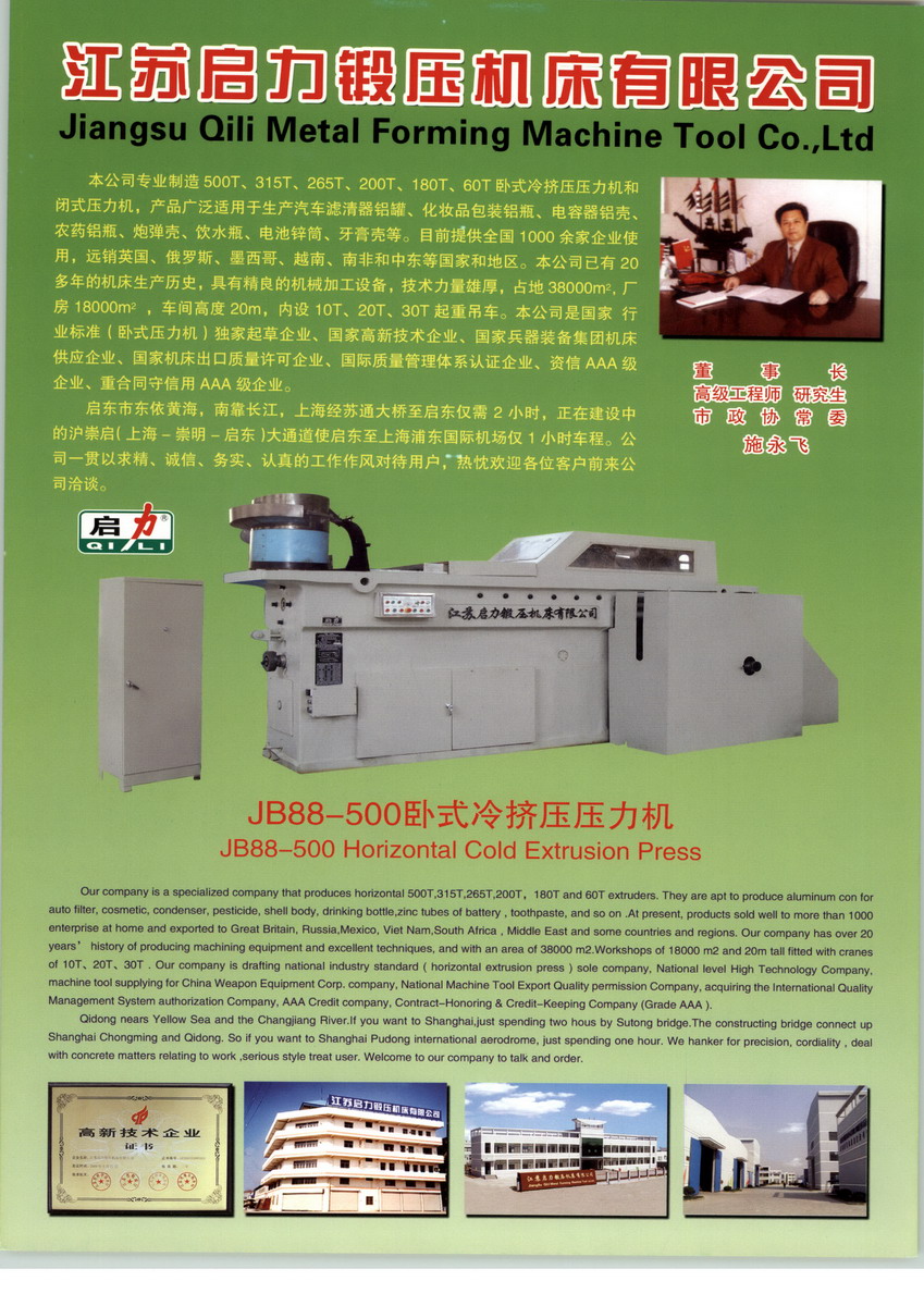 江蘇啟力鍛壓機(jī)床有限公司專業(yè)制造臥式冷擠壓壓力機(jī)、立式多連桿肘桿式冷擠壓壓力機(jī)、閉式單點(diǎn)壓力機(jī)三大系列。臥式冷擠壓壓力機(jī)系列有:600KN、2000KN、2650KN、3150KN、3500KN、5000KN、7200KN、10000KN等,此類產(chǎn)品廣泛適用于生產(chǎn)電容器鋁殼、化工包裝鋁瓶、農(nóng)藥包裝鋁瓶、化妝品包裝鋁瓶、電池鋅筒、運(yùn)動(dòng)水壺、動(dòng)力電池鋁殼、汽車鋁罐(管)、炮彈彈筒等。立式多連桿肘桿式冷擠壓壓力機(jī)系列有:2500KN、4000KN、6300KN等,該系列產(chǎn)品適用于金屬坯料冷擠壓或溫?cái)D壓成形。閉式單點(diǎn)壓力機(jī)系列有:1600KN、2500KN、4000KN、6300KN等,該系列產(chǎn)品可以進(jìn)行沖裁、成形、彎曲、淺拉伸等,對(duì)沖制各種薄板成形零件更為合適,廣泛適用于汽車、拖拉機(jī)、船舶、農(nóng)業(yè)機(jī)械、輕紡機(jī)械、電氣、電機(jī)、儀表、航空、兵器等行業(yè)。本公司產(chǎn)品目前提供國(guó)內(nèi)1000余家企業(yè)使用,遠(yuǎn)銷英國(guó)、法國(guó)、墨西哥、俄羅斯、緬甸和中東等國(guó)家和地區(qū)。公司已有20多年的機(jī)床生產(chǎn)歷史,具有精良的機(jī)械加工設(shè)備,技術(shù)力量雄厚,研究生有6名、高級(jí)工程師6名組成的工程師團(tuán)隊(duì)。已獲11件國(guó)家專利,其中3件獲國(guó)家發(fā)明型專利。占地38000㎡,廠房18000㎡,車間高度20m,是國(guó)家高新技術(shù)企業(yè)、國(guó)家行業(yè)標(biāo)準(zhǔn)(臥式壓力機(jī))獨(dú)家起草企業(yè)、國(guó)家兵器裝備集團(tuán)機(jī)床供應(yīng)企業(yè)、國(guó)際質(zhì)量管理體系認(rèn)證企業(yè)、國(guó)家機(jī)床出口質(zhì)量許可企業(yè)、資信AAA級(jí)企業(yè)、重合同守信用AAA級(jí)企業(yè)。公司位于省級(jí)開發(fā)區(qū)——啟東市開發(fā)區(qū)內(nèi)。啟東市東依黃海,南靠長(zhǎng)江。上海經(jīng)蘇通大橋啟東僅需2小時(shí);滬崇啟(上海——崇明——啟東)大通道使啟東至上海浦東國(guó)際機(jī)場(chǎng)僅1小時(shí)車程。公司一貫以求精、誠(chéng)信、務(wù)實(shí)、認(rèn)真的工作作風(fēng)對(duì)待用戶,熱誠(chéng)歡迎各位客戶前來洽談。 公司恪守“質(zhì)量取勝、用戶至上”的企業(yè)宗旨。公司董事長(zhǎng)、總經(jīng)理施永飛率全體員工熱忱歡迎各位客戶前來合作洽談,愿我們攜手共創(chuàng)美好未來。
