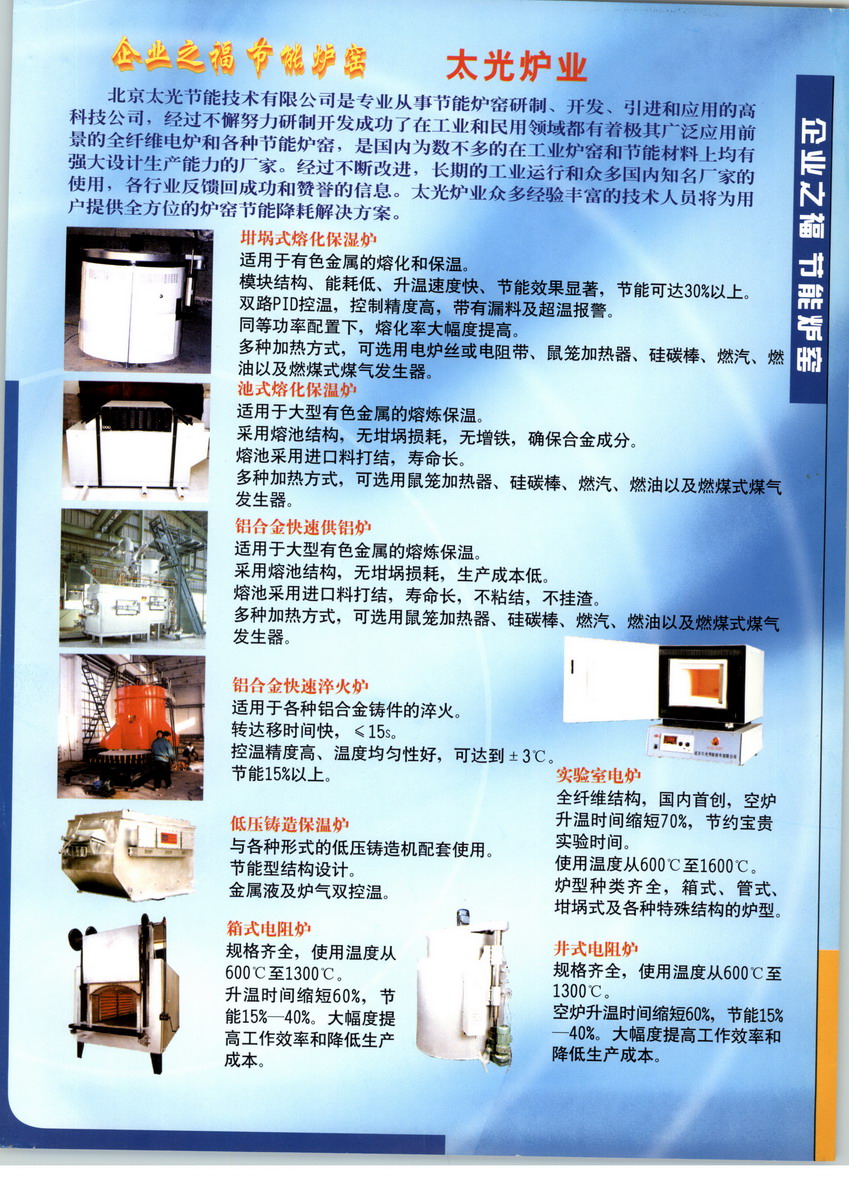 北京太光節(jié)能技術(shù)有限公司是立式淬火爐、臺(tái)車爐、深井爐、T6處理、熔鋁爐、低壓鑄造保溫爐、坩堝爐、淬火爐、時(shí)效爐、實(shí)驗(yàn)室電爐等產(chǎn)品專業(yè)生產(chǎn)加工的有限責(zé)任公司,公司總部設(shè)在朝陽(yáng)區(qū)建外SOHO 6-2903,北京太光節(jié)能技術(shù)有限公司擁有完整、科學(xué)的質(zhì)量管理體系。北京太光節(jié)能技術(shù)有限公司的誠(chéng)信、實(shí)力和產(chǎn)品質(zhì)量獲得業(yè)界的認(rèn)可。歡迎各界朋友蒞臨北京太光節(jié)能技術(shù)有限公司參觀、指導(dǎo)和業(yè)務(wù)洽談。