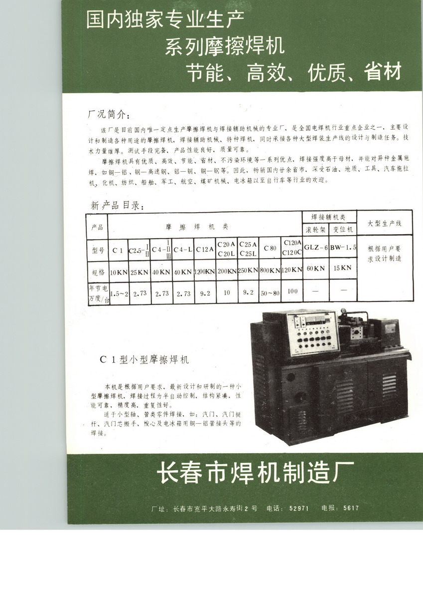 自 1979 年我公司在國內(nèi)專業(yè)化生產(chǎn)摩擦焊機(jī)以來,該機(jī)以其高效、節(jié)能、省材、焊接強(qiáng)度高、無污染和操作簡單等優(yōu)勢,已廣泛用于汽車、摩托車、石油工具、軍工、煤礦等行業(yè)。焊接了排氣閥、汽門搬手、剎車推桿、萬向節(jié)筒體、減震器連桿和阻尼管、球頭總成、套筒搬手、半軸、后橋、液壓千斤頂筒體等十幾種汽車零部件。