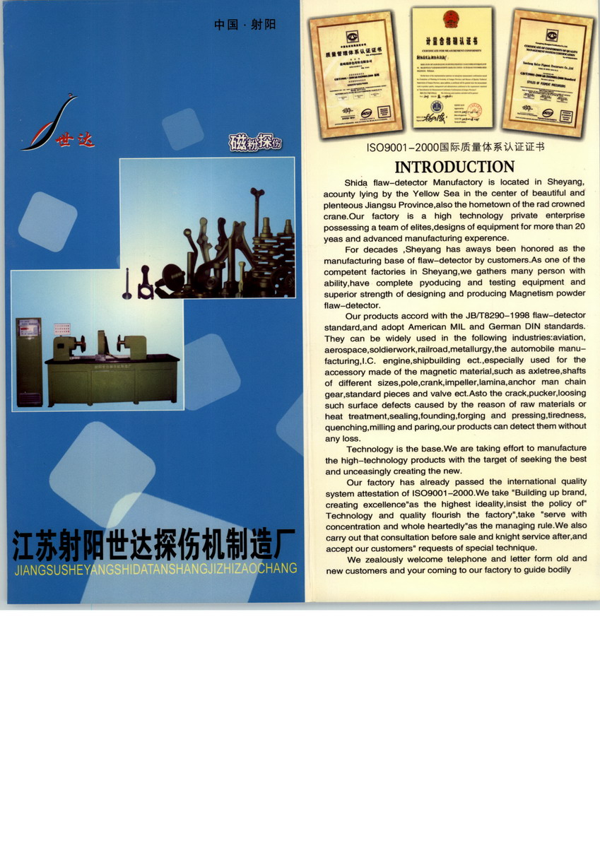 世達(dá)探傷機(jī)制造有限公司位于江蘇中部美麗富饒的黃海之濱。丹頂鶴的故鄉(xiāng)——射陽(yáng),是依靠精英組合,集我國(guó)近20多年磁粉探傷設(shè)備設(shè)計(jì)、制造先進(jìn)經(jīng)驗(yàn)而創(chuàng)建的民營(yíng)高新技術(shù)企業(yè)。 二十年來(lái),射陽(yáng)一直被用戶譽(yù)為我國(guó)磁粉探傷設(shè)備的制造基地。本公司人才薈萃,生產(chǎn)、測(cè)試設(shè)備齊全,具有很強(qiáng)的磁粉探傷設(shè)備的設(shè)計(jì)和生產(chǎn)能力,是射陽(yáng)較強(qiáng)的磁粉探傷設(shè)備制造公司之一。 企業(yè)產(chǎn)品符合JB/T8290-1998《磁粉探傷機(jī)》標(biāo)準(zhǔn),并采用美國(guó)MIL和德國(guó)DIN標(biāo)準(zhǔn)。產(chǎn)品廣泛應(yīng)用于航空、航天、軍工、鐵路、冶金、汽車制造、內(nèi)燃機(jī)、造船業(yè)、彈簧、壓力容器、石化、橋梁、油田、機(jī)械制造等行業(yè),如鍛壓件、軸承、大小軸類、連桿、曲軸、葉輪、葉片、錨鏈、齒輪、標(biāo)準(zhǔn)件、閥門等鐵磁性材料制成的零件,因原材料的原因或者熱處理、焊接、鑄造、鍛壓、疲勞、淬火、磨削二引起的裂紋、夾渣、折疊、疏松等表面缺陷的無(wú)損檢測(cè)。 我公司堅(jiān)持科技立公司,以不求唯一,但求第一的產(chǎn)品開(kāi)發(fā)目標(biāo)及不斷創(chuàng)新的開(kāi)發(fā)思路來(lái)設(shè)計(jì)生產(chǎn)出高科技產(chǎn)品。本公司已通過(guò)ISO9001-2000國(guó)際質(zhì)量體系認(rèn)證。