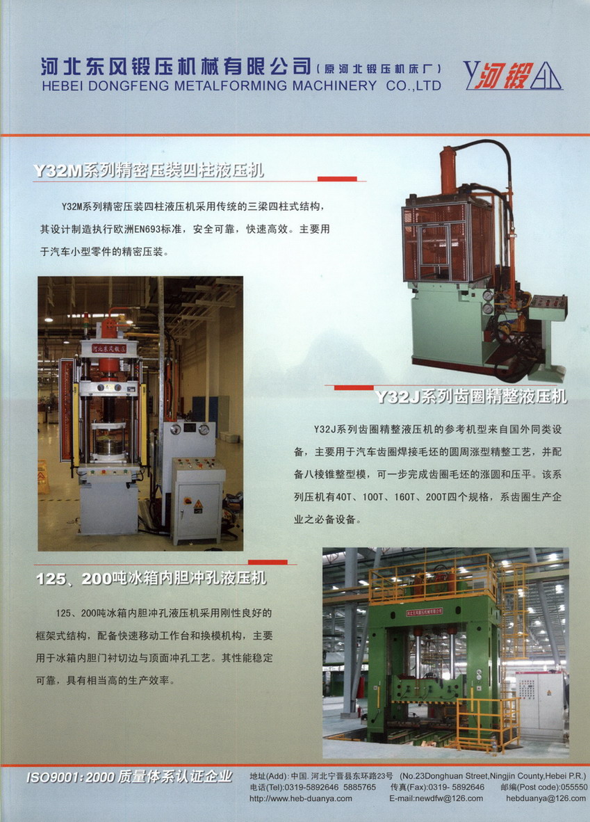 液壓機(jī)產(chǎn)品曾榮獲河北省科技進(jìn)步獎(jiǎng),主要規(guī)格有Y27單動(dòng)拉伸系列、Y28雙動(dòng)拉伸系列、Y30單柱系列、Y31雙柱系列、Y32四柱系列、Y40單柱精密校直系列、Y41單柱校正壓裝系列、Y47多工位、與濟(jì)南巨能合作生產(chǎn)ZDYJ系列自由鍛造液壓機(jī)、MDYJ系列熱模鍛造液壓機(jī)、D52、D53K系數(shù)控列輾環(huán)機(jī)、HFC系列開(kāi)卷、校平、剪切、堆垛生產(chǎn)線;數(shù)控鉆孔切割復(fù)合機(jī)等。噸位從2.5噸到6000噸(包括自由鍛造液壓機(jī))、30000噸以下熱模鍛造液壓機(jī),共十三大類近百個(gè)品種,廣泛用于汽車(chē)制造行業(yè)、船舶制造行業(yè)、航空制造行業(yè)、化工設(shè)備制造行業(yè)、電力設(shè)備制造行業(yè)、鋼鐵冶金行業(yè)、鍛造行業(yè)、鐵路行業(yè)、煤礦機(jī)械行業(yè)、家電行業(yè)、電子行業(yè)等。產(chǎn)品遠(yuǎn)銷(xiāo)全國(guó)二十多個(gè)省、市、自治區(qū),并多次出口日本、土耳其、越南等十幾個(gè)國(guó)家和地區(qū)。