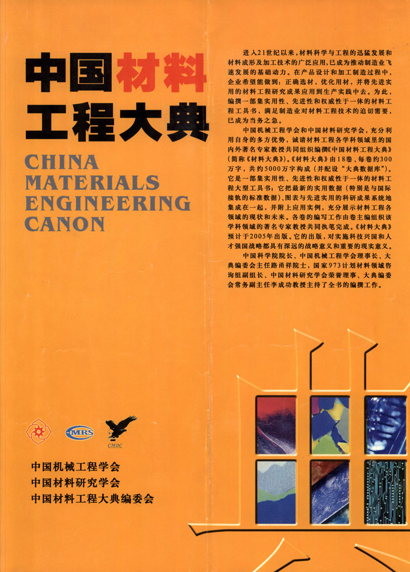 《中國材料工程大典》是關(guān)于材料制備和測試、材料成形與加工工程的大型工具書,由中國機(jī)械工程學(xué)會(huì)、中國材料研究學(xué)會(huì)組織編寫,中國科學(xué)院路甬祥院長擔(dān)任編委會(huì)主任,師昌緒院士等做顧問, 39位院士、1200余位專家教授共同執(zhí)筆?!洞蟮洹饭?nbsp;26 卷,近 7000 萬字,是我國當(dāng)前規(guī)模最大、內(nèi)容最全面的材料工程工具書。