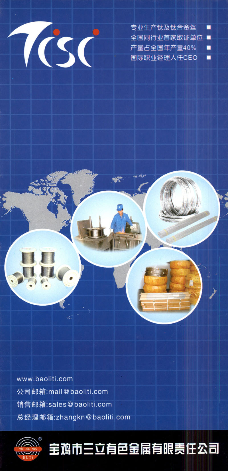 寶雞市三立有色金屬有限責(zé)任公司是鈦及鈦合金(鈦絲、醫(yī)用鈦材、鈦棒、鈦彈簧)、絲材、棒材、板材、管材、專業(yè)生產(chǎn)著名廠家,注冊(cè)商標(biāo)“寶立鈦”,又是有色金屬生產(chǎn)、加工、銷售、貿(mào)易、研發(fā)為一體的現(xiàn)代化專業(yè)生產(chǎn)廠家。