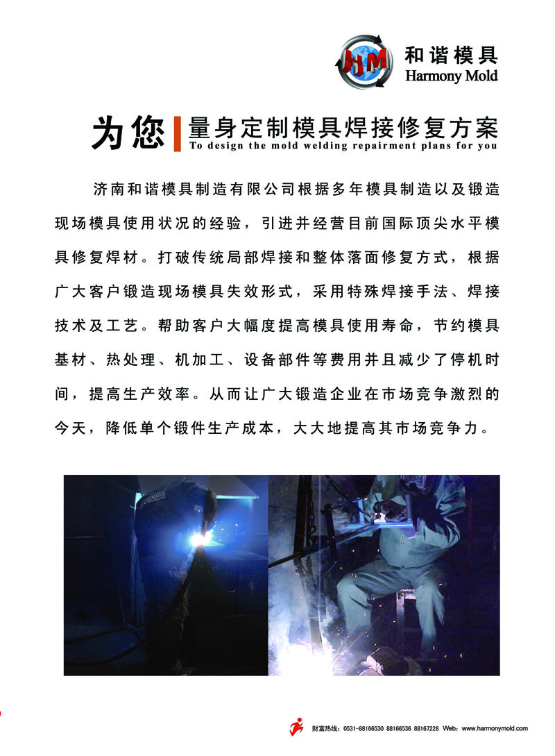 濟(jì)南和諧模具制造有限公司,是一家專業(yè)從事模具開發(fā)制造,模具焊接修復(fù),模具焊材進(jìn)口銷售,技術(shù)支持與服務(wù),以及鍛造零部件出口等一體化公司。公司擁有先進(jìn)焊接系統(tǒng)和大中型數(shù)控加工中心,擁有眾多經(jīng)驗(yàn)豐富的技術(shù)和外貿(mào)人員以及專業(yè)熟練操作工人。公司嚴(yán)格按照ISO9000:2008的要求,組織生產(chǎn)銷售、控制產(chǎn)品質(zhì)量,深得廣大用戶厚愛。