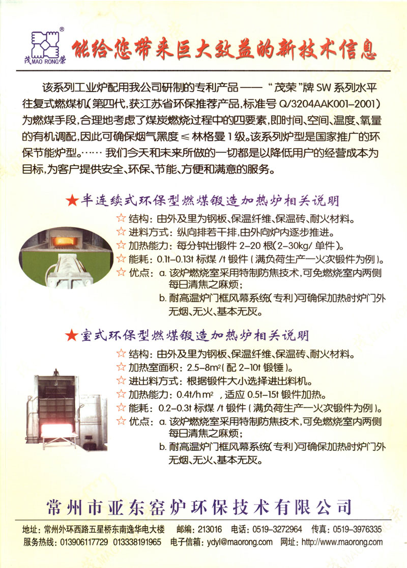 本公司是中國(guó)鍛造協(xié)會(huì)會(huì)員、江蘇省環(huán)境保護(hù)產(chǎn)業(yè)協(xié)會(huì)會(huì)員,市民營(yíng)科技協(xié)會(huì)會(huì)員,多年重合同守信用單位,是專業(yè)化的環(huán)保節(jié)能技術(shù)開(kāi)發(fā)公司,產(chǎn)品獲得多項(xiàng)國(guó)家專利。