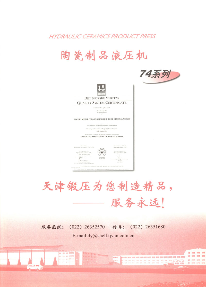 天津市鍛壓機床總廠是我國起步最早的企業(yè),現有固定資產2.4億元各類專業(yè)技術人員480人,是機械部大型骨干企業(yè)。自我廠自行設計國內第一臺液壓機,開創(chuàng)了我國中小型液壓機生產歷史以來,目前擁有26個系列,300余品種,產品從80KN至5000KN,以形成年產1200臺各類液壓機的生產能力,居國內同行業(yè)之首。1983年YT32-315四柱液壓機獲國家銀牌,1990年YT32-630/1030雙動力拉伸液壓機一舉榮獲同行業(yè)唯一的國家金獎另有部優(yōu)產品3項,市優(yōu)產品5項。產品廣泛適用于汽車制造、粉末冶金、金屬冷擠、輕工家電、化工機戒、航空航天、模具磨料、機戒制造等行業(yè),被國家指定為替代進口產品,行銷全國,產品出口到日本、荷蘭、東南亞等20多個地區(qū)和國家、市場占有率居全國同行業(yè)第一。