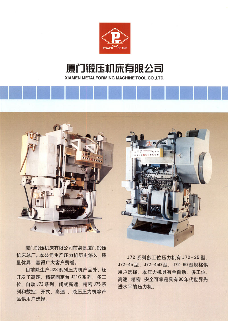 廈門鍛壓機(jī)床有限公司系輝煌重工集團(tuán)公司全資子公司。其前身為廈門鍛壓機(jī)床總廠,榮獲“國家二級企業(yè)”稱號,是原機(jī)械部重點(diǎn)企業(yè)及我國機(jī)械壓力機(jī)專業(yè)制造廠之一。公司產(chǎn)品注冊商標(biāo)“力牌”,具有五十多年生產(chǎn)機(jī)械壓力機(jī)的歷史。
