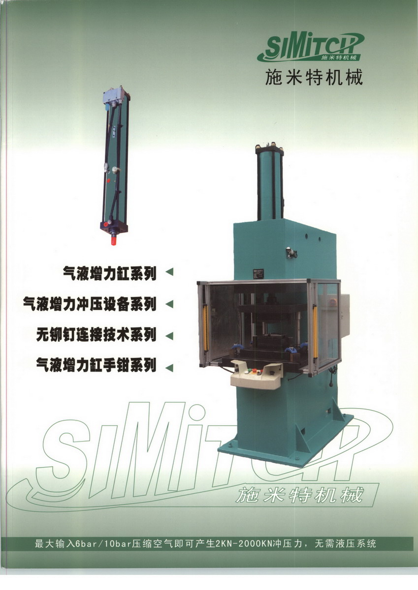 蘇州施米特機(jī)械有限公司系一專業(yè)研發(fā)、生產(chǎn)、制造氣動、液壓領(lǐng)域相關(guān)產(chǎn)品之公司,公司成立于2006年9月。主要產(chǎn)品包括:氣缸、油壓缸、氣液增力缸、增壓器、氣動沖壓機(jī)、氣液增力沖壓設(shè)備、氣液增力壓鉚設(shè)備、氣液增力壓力裝配設(shè)備、氣液增力無鉚釘連接設(shè)備、氣液增力無鉚釘連接手鉗、油壓機(jī)、液壓泵站、各類工裝夾具及專機(jī)設(shè)備等,尤其在氣液增力系列產(chǎn)品及相關(guān)及氣動沖壓設(shè)備上有著多年的研發(fā)制造經(jīng)驗,產(chǎn)品具有壽命長、精度高、輸出力大、體積小、無泄露等特性,產(chǎn)品形成系列化、多元化能滿足客戶不同需求,同時能為客戶設(shè)計制造特殊要求產(chǎn)品。公司目前開發(fā)的產(chǎn)品廣泛應(yīng)用于汽車零部件、電子產(chǎn)品及鈑金件的沖壓、鉚接、無鉚釘連接、壓力裝配、翻邊鉚合、封口、拉伸成型、沖裁、剪切等工藝。