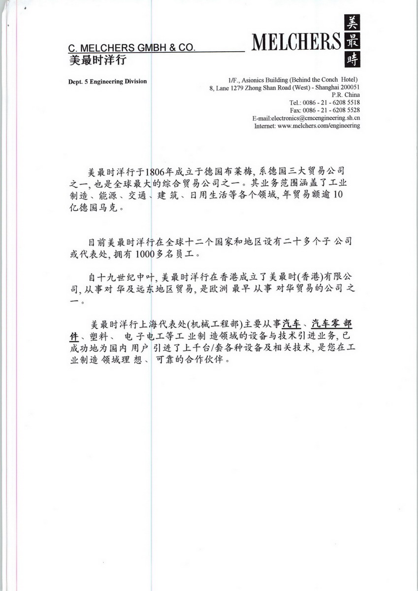 MEICHERS美最時洋行上海代表處(機械工程部)主要從事汽車、汽車零部件、電子電工等工業(yè)制造領(lǐng)域的設(shè)備與技術(shù)引進業(yè)務(wù)。