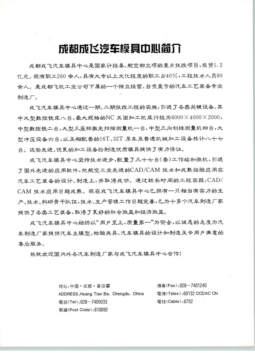 四川成飛集成科技股份有限公司(簡稱"成飛集成")成立于2000年,是由中航工業(yè)集團控股的高科技股份有限公司。公司以工模具設計、研制和制造為主業(yè),代表性產(chǎn)品是中高檔轎車的側(cè)圍、頂蓋、車門、翼子板等大型、高檔次的外覆蓋件模具。