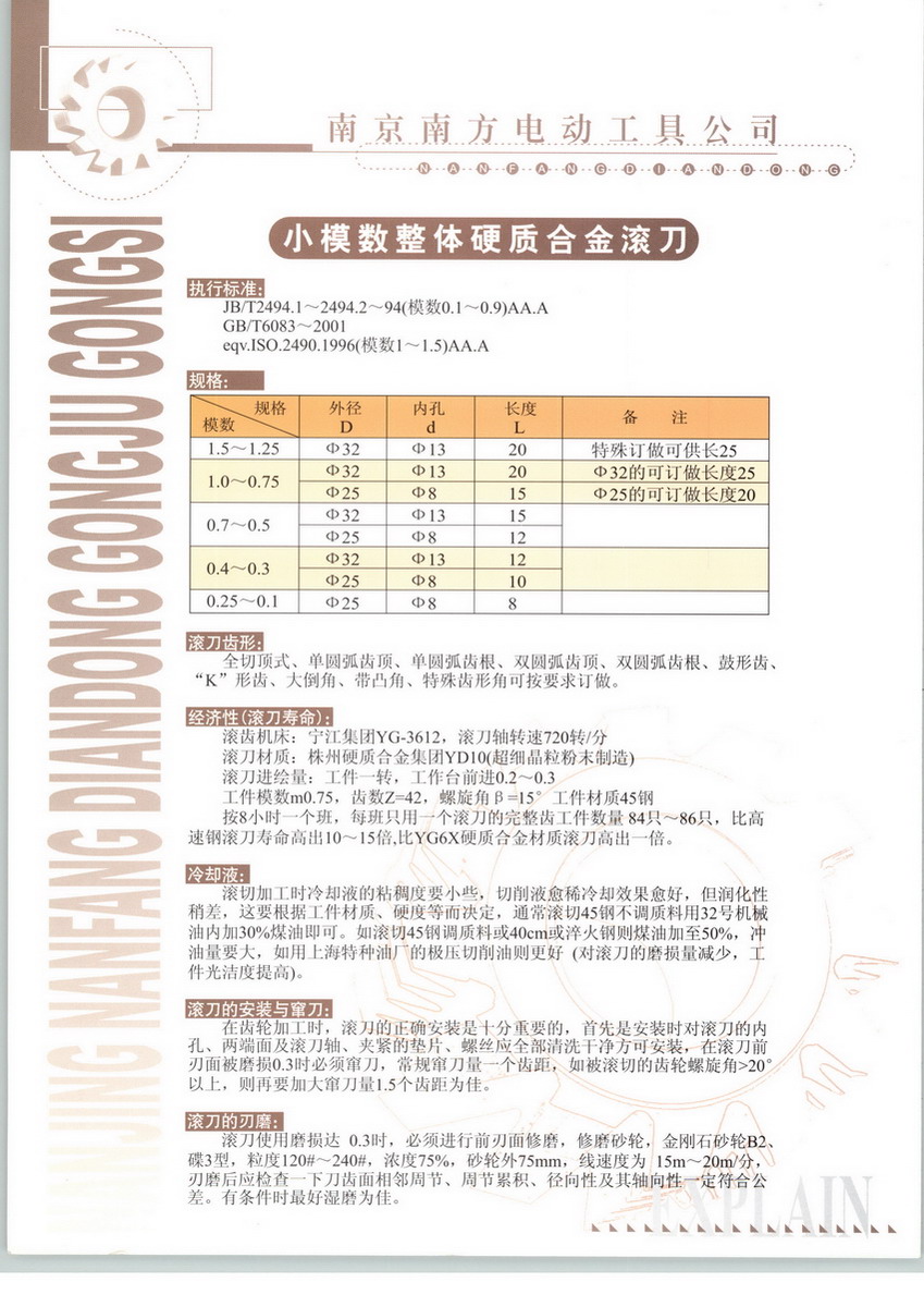南京南方電動工具公司是從事研制、開發(fā)和規(guī)模生產(chǎn)小模數(shù)圓柱形齒輪、齒軸以及硬質(zhì)合金滾刀的專業(yè)化廠家。在國內(nèi)電動工具行業(yè)裝機用齒輪、齒軸,電光源繞絲機及精密減速器用,低噪音齒輪等領(lǐng)域享有盛譽。