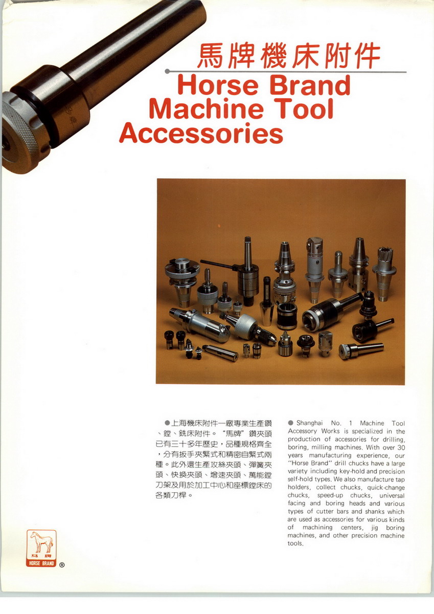 公司繼承和發(fā)揚(yáng)了“馬牌”開拓求精、誠(chéng)實(shí)奮進(jìn)的精神,致力提升產(chǎn)品質(zhì)量與服務(wù),主要產(chǎn)品有“馬牌”鉆夾頭、攻絲夾頭、快換夾頭、彈性?shī)A套、XT/BT/JT/ST數(shù)控刀柄、回轉(zhuǎn)頂尖、莫氏變徑套、莫氏接桿,加長(zhǎng)變徑套等。為上海工具廠附件類優(yōu)質(zhì)生產(chǎn)基地。