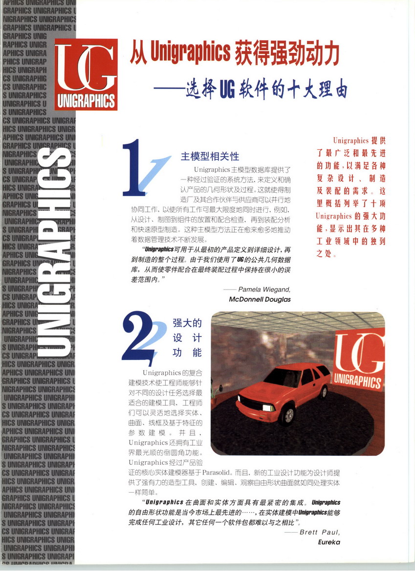 UG軟件起源于美國麥道飛機公司,后于1991年11月并入世界上最大的軟件公司--EDS公司。美國通用汽車公司是UG軟件的最大用戶。 UG軟件現(xiàn)已廣泛地應(yīng)用于通用機械,模具,汽車及航天等領(lǐng)域。UG軟件進入中國十九年,得到了越來越廣泛的應(yīng)用,已成為我國工業(yè)界主要使用的大型CAD/CAE/CAM軟件之一 Unigraphics NX_ 一個適于完整的產(chǎn)品工程的己證實的解決方案,去極好地幫助制造商。使公司能夠在一集成的數(shù)字化環(huán)境中去模擬、驗證產(chǎn)品和他們的生產(chǎn)過程。適于完整的產(chǎn)品工程的Unigraphics NX通過有效地捕捉、應(yīng)用和共享整個數(shù)字化過程的知識為制造商遞交一戰(zhàn)略優(yōu)勢。從初始的概念設(shè)計、到產(chǎn)品設(shè)計、仿真和制造工程,Unigraphics NX提供一基於幫助你滿足你的商業(yè)目標的先進技術(shù)的綜合產(chǎn)品開發(fā)解決方案。