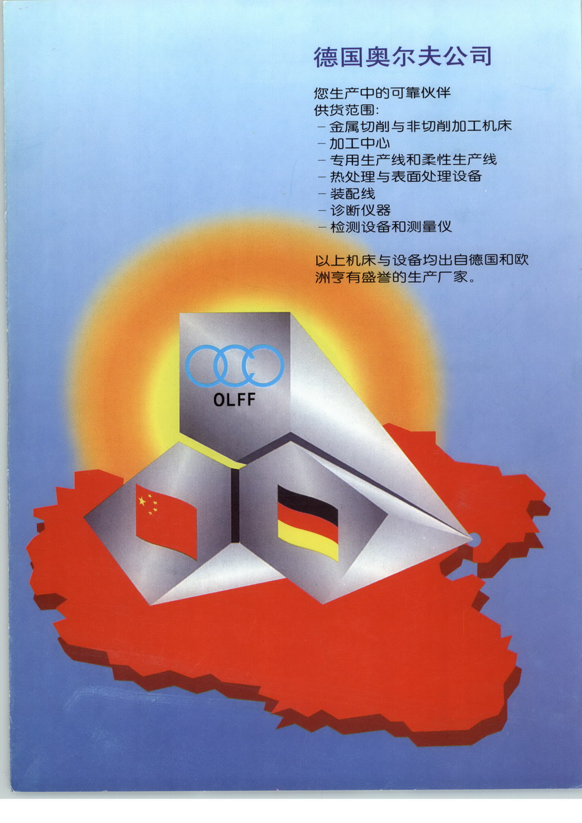 德國(guó)奧爾夫公司從屬于德國(guó)MAN企業(yè)集團(tuán)。MAN企業(yè)集團(tuán)是歐洲主要資本貨物的供應(yīng)商,他每年的銷售額約180億馬克,其產(chǎn)品的半數(shù)以上外銷。奧爾夫公司在中國(guó)市場(chǎng)已有50多年的經(jīng)驗(yàn),主要經(jīng)銷德國(guó)和歐洲先進(jìn)生產(chǎn)廠家的產(chǎn)品,包括:金屬切削與非切削加工機(jī)床;加工中心;自動(dòng)生產(chǎn)線與柔性加工;各種熱處理和表面處理設(shè)備;裝配生產(chǎn)線;檢測(cè)設(shè)備和儀器;深基礎(chǔ)施工設(shè)備。