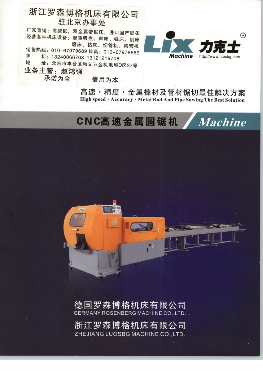德國羅森博格機(jī)床有限公司控股的(浙江羅森博格機(jī)床有限公司),總部設(shè)在香港,是一家集研發(fā)、生產(chǎn)、銷售為一體,專業(yè)從事高端機(jī)床金屬加工設(shè)備的綜合性大型企業(yè)。公司的(金屬圓棒. 管. 不銹鋼. 銅.鋁等)高精度鋸切、 彎曲、 倒角、 管端成型、 汽車零部件加工等產(chǎn)品在機(jī)床制造行業(yè)處于領(lǐng)先地位。公司秉承“技術(shù)一流、管理一流、產(chǎn)品一流”的宗旨,在“貢獻(xiàn)社會(huì)、科技創(chuàng)新、追求卓越”理念指導(dǎo)下,團(tuán)結(jié)拼搏、艱苦奮斗,不斷推出新產(chǎn)品,積極引進(jìn)現(xiàn)代化的管理模式,以改革、創(chuàng)新、高效、務(wù)實(shí)的企業(yè)形象展現(xiàn)在中國高端機(jī)床設(shè)備市場(chǎng)。 羅森博格堅(jiān)持“以人為本、優(yōu)質(zhì)高效、持續(xù)改進(jìn)、顧客滿意”的質(zhì)量方針,狠抓產(chǎn)品質(zhì)量,把質(zhì)量管理落實(shí)到生產(chǎn)過程中的每一個(gè)細(xì)節(jié),全面通過ISO9001-2008國際質(zhì)量認(rèn)證管理體系,擁有完善的質(zhì)量管理體系,有力地確保了產(chǎn)品的質(zhì)量,公司先后榮獲“國家高新技術(shù)企業(yè)”;“ 浙江省機(jī)床工具商標(biāo)品牌基地成員企業(yè)”; “中國機(jī)械安全認(rèn)證企業(yè)”;“行業(yè)規(guī)模大型企業(yè)”; “ AAA級(jí)資信企業(yè)”等榮譽(yù),并獲得多項(xiàng)發(fā)明專利。公司主要產(chǎn)品有目前最先進(jìn)的CNC高速圓鋸機(jī),CNC數(shù)控彎管機(jī).,金屬切管機(jī).,高速鋁材鋸切機(jī), 管端成型及管端倒角等系列設(shè)備。 在汽車零部件、造船工業(yè)、 航天工業(yè)、 石油化工、 大型鍋爐、 家具及健身器材等行業(yè)提供所需要的專用機(jī)械和成套設(shè)備。產(chǎn)品從研發(fā)、設(shè)計(jì)、采購、生產(chǎn)、檢驗(yàn)、倉儲(chǔ)到銷售等整個(gè)生產(chǎn)線,都運(yùn)用了科學(xué)管理模式,各個(gè)環(huán)節(jié)相互配合,有條不紊,高效有序,成為羅森博格產(chǎn)量和質(zhì)量的堅(jiān)強(qiáng)后盾。以香港為銷售總部和研發(fā)中心. 以浙江為新品測(cè)試與加工基地的跨區(qū)的大型公司. 在華東. 華北. 華南和華中區(qū)域分別設(shè)有區(qū)域分部及客戶服務(wù)中心. 銷售和服務(wù)部遍布全國各地. 同時(shí)在全球多個(gè)國家設(shè)有營銷總部.“LIX力克士”品牌憑借精準(zhǔn)的產(chǎn)品定位,深厚的企業(yè)文化,誠信的企業(yè)商譽(yù),先進(jìn)的營銷模式贏得了廣大消費(fèi)者的信賴,得到了消費(fèi)者和全球合作伙伴的認(rèn)可和好評(píng)!精湛的技術(shù),優(yōu)質(zhì)的產(chǎn)品,完善的服務(wù)使我們與世界走的更近。我們將積極拓展海外技術(shù)合作與貿(mào)易往來,朝管理規(guī)?;?、市場(chǎng)國際化、產(chǎn)品優(yōu)質(zhì)化的方向發(fā)展。我們的目標(biāo)是制造最好的機(jī)床設(shè)備,把羅森博格打造成高端機(jī)床設(shè)備全球供應(yīng)商。
