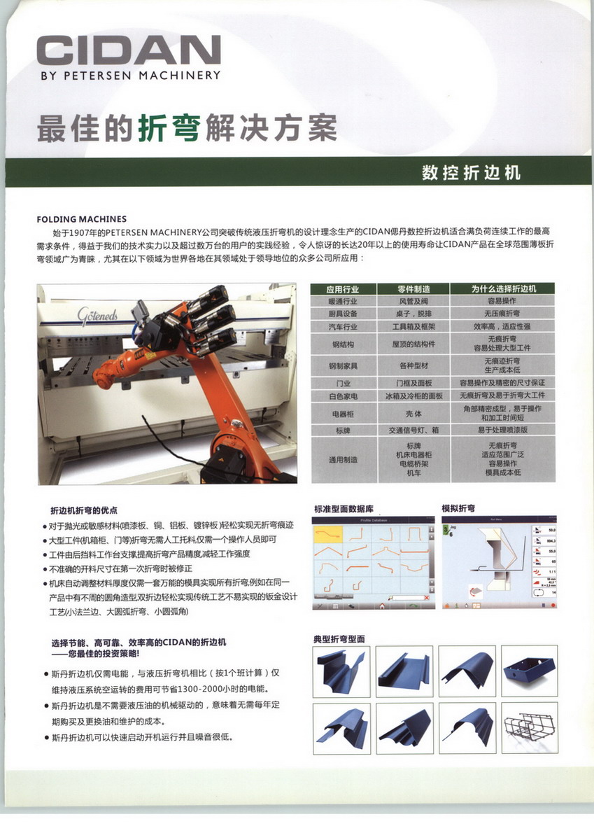丹麥獨(dú)資上海偲丹機(jī)械設(shè)備貿(mào)易有限公司是丹麥Petersen Machinery China Holding ApS獨(dú)資在中國(guó)投資的第一家公司,負(fù)責(zé)向中國(guó)以及亞洲地區(qū)銷(xiāo)售Petersen Machinery公司生產(chǎn)的機(jī)械設(shè)備及售后服務(wù)工作。作為全球精密鈑金切割及折彎?rùn)C(jī)械的領(lǐng)導(dǎo)者,Petersen Machinery公司在鈑金機(jī)械生產(chǎn)領(lǐng)域歷史悠久,口碑極佳,銷(xiāo)售和服務(wù)網(wǎng)絡(luò)遍布全球40個(gè)國(guó)家?!,F(xiàn)如今大部分鈑金機(jī)械都在該公司位于瑞典和丹麥的工廠生產(chǎn),總生產(chǎn)面積11000M2,每年可生產(chǎn)1000臺(tái)以上設(shè)備,其中大部分為數(shù)控機(jī)床。用于向中國(guó)以及亞洲地區(qū)銷(xiāo)售Petersen Machinery公司生產(chǎn)的機(jī)械設(shè)備,主要產(chǎn)品包括:全系列數(shù)控折邊機(jī)、精密機(jī)械剪板機(jī)、開(kāi)卷、分條生產(chǎn)線等。1907年自公司成立以來(lái),就致力于開(kāi)發(fā)簡(jiǎn)單,高效,可靠的鈑金加工設(shè)備,所有設(shè)備都按我們獨(dú)創(chuàng)的理念自行開(kāi)發(fā)設(shè)計(jì)制造和組裝。在很多領(lǐng)域我公司的設(shè)備為世界各地在其領(lǐng)域處于領(lǐng)導(dǎo)地位的眾多公司所應(yīng)用。