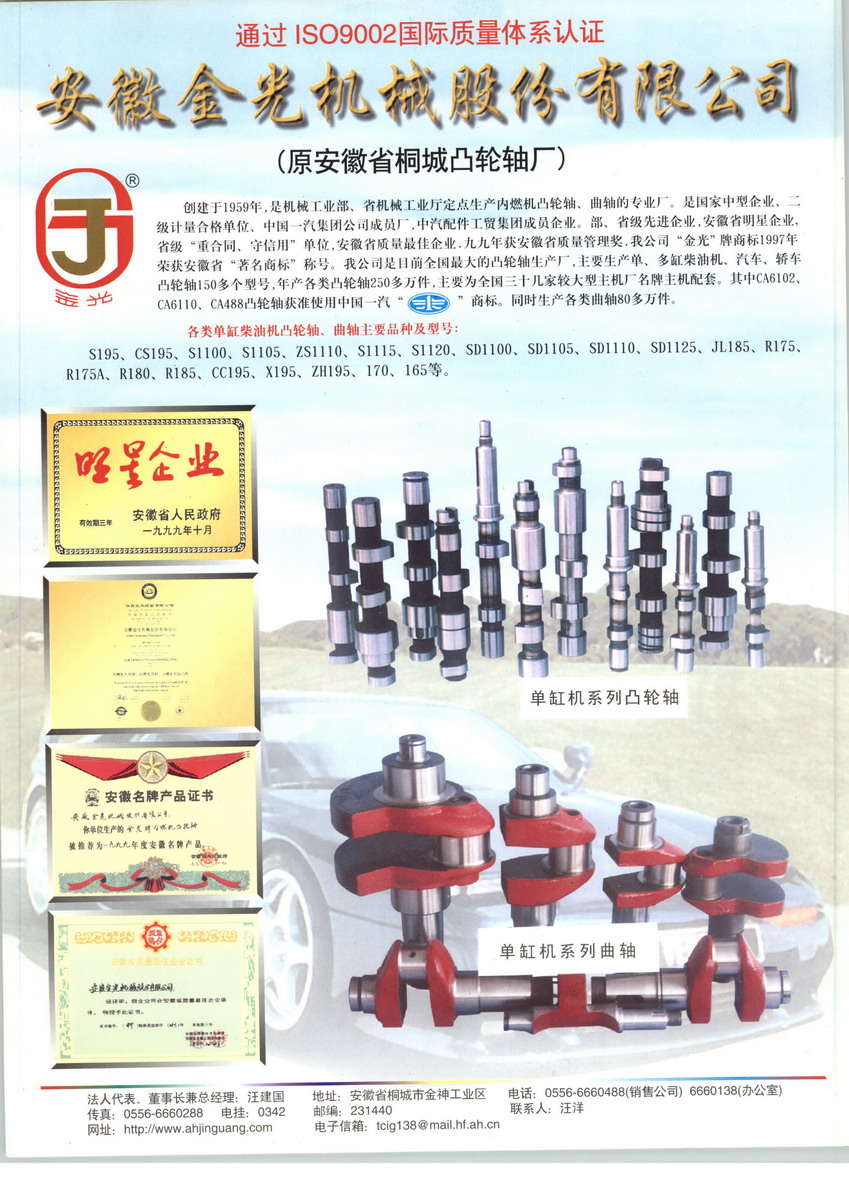 安徽金光機(jī)械股份有限公司是集研制、開(kāi)發(fā)、生產(chǎn)、銷(xiāo)售于一體的國(guó)內(nèi)最大的凸輪軸、曲軸、氣門(mén)等內(nèi)燃機(jī)零部件專(zhuān)業(yè)公司,現(xiàn)為國(guó)家中型企業(yè),中國(guó)機(jī)械500強(qiáng)企業(yè),全國(guó)技術(shù)創(chuàng)新示范單位,安徽省高新技術(shù)企業(yè),安徽省明星企業(yè),部級(jí)、省級(jí)先進(jìn)企業(yè),省質(zhì)量最佳企業(yè),省質(zhì)量管理獎(jiǎng)單位,計(jì)量檢測(cè)體系二級(jí)確認(rèn)合格企業(yè),農(nóng)行“aaa”級(jí)資信單位,省級(jí)“誠(chéng)信納稅企業(yè)”,省級(jí)“重合同,守信用”單位,中國(guó)汽配工貿(mào)集團(tuán)企業(yè),iso9001:2000質(zhì)量管理體系認(rèn)證企業(yè),是具有自營(yíng)進(jìn)出口權(quán)資格企業(yè)。 公司占地面積25萬(wàn)平方米,其中建筑面積8.5萬(wàn)平方米,總資產(chǎn)1.5億元,其中固定資產(chǎn)1.2億元,擁有各類(lèi)主要設(shè)備600臺(tái)(套),公司現(xiàn)有六部、十三個(gè)車(chē)間、十二個(gè)科室,公司現(xiàn)有員工1200余人,其中各類(lèi)中、高級(jí)專(zhuān)業(yè)技術(shù)人員280余人。公司擁有現(xiàn)代化的凸輪軸、曲軸和氣門(mén)生產(chǎn)線,并從德國(guó)和美國(guó)分別引進(jìn)了具有國(guó)際先進(jìn)水平的cnc全數(shù)控凸輪軸加工、檢測(cè)中心。公司建有“省級(jí)技術(shù)中心”和cad工作站,擁有國(guó)內(nèi)一流的科研開(kāi)發(fā)人才隊(duì)伍。多年來(lái),企業(yè)不斷加快新產(chǎn)品的研發(fā)和技術(shù)創(chuàng)新,推進(jìn)名牌戰(zhàn)略的實(shí)施,積極運(yùn)用現(xiàn)代企業(yè)制度,加強(qiáng)企業(yè)各項(xiàng)管理,各項(xiàng)經(jīng)濟(jì)技術(shù)指標(biāo)均名列全國(guó)同行業(yè)前茅,正跨入規(guī)模經(jīng)營(yíng)、規(guī)模效益的發(fā)展階段。