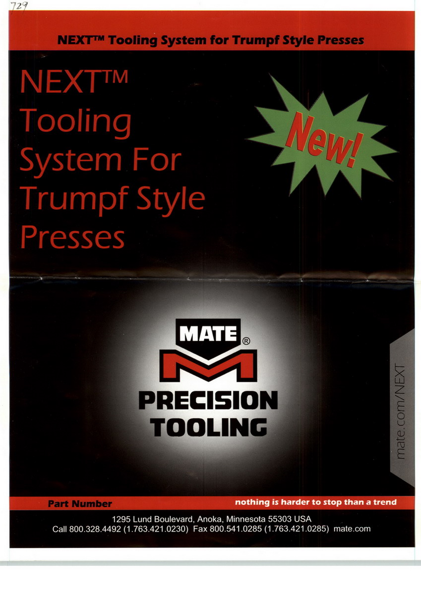 美國MATE模具公司成立于1962年??偛课挥诿绹髂崽K達(dá)州,阿諾卡(ANOKA),靠近五大湖區(qū)。工廠建筑面積為大約30,000多平方米,共有五百多名員工,年銷售額超過80,000,000.00美元。數(shù)控沖床模具是我們唯一的業(yè)務(wù)。另外,我們?cè)诘聡?,英國建有分支工廠,在馬來西亞,瑞典,中國設(shè)有銷售代表處,在全球65個(gè)國家有代理商。公司有一大批專業(yè)工程師為客戶提供高質(zhì)量的技術(shù)服務(wù)。