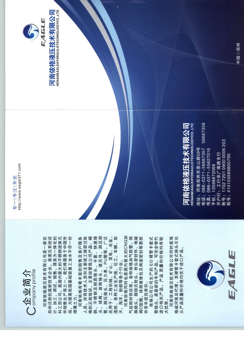 河南依格液壓技術(shù)有限公司是一家專業(yè)從事中高壓閥門、電磁閥、快換接頭、接頭、軟管總成等流體原件的生產(chǎn)及銷售的公司。各種不銹鋼球閥、三通球閥、非標(biāo)件、旋轉(zhuǎn)接頭、大規(guī)格法蘭、接頭,0泄露快換接頭、管夾、單向閥、測壓軟管測試點接頭、節(jié)流閥、調(diào)節(jié)閥等等派克、伊頓、EMB、JS、瑪奴力、雙威河南分銷商硬管接頭:卡套式管接頭、焊接式管接頭、快換接頭、壓力表接頭、測試點接頭、管夾、法蘭、單向閥、截止閥、球閥以及軟管扣壓機(jī)、卡套預(yù)裝和擴(kuò)口機(jī)等各種規(guī)格專用連接件。高中低壓膠管總成:各種規(guī)格超高、高、中、低壓軟管。各種規(guī)格型號軟管接頭如:24°錐接頭、擴(kuò)口式接頭、法蘭式接頭等專用軟管接頭。各種規(guī)格的軟管總成,及軟管總成加工設(shè)備。如:軟管扣壓機(jī)、軟管切割機(jī)、軟管清洗機(jī)等。儀器儀表:儀表管接頭 ,超高純管接頭和靜密封件,球閥、旋塞閥、針閥和單向閥等等。電磁閥:二位二通電磁閥、二位三通,四通,五通電磁閥、121系列電磁閥、比例調(diào)節(jié)閥、熱水,蒸汽電磁閥、液壓油,中性液體電磁閥等。