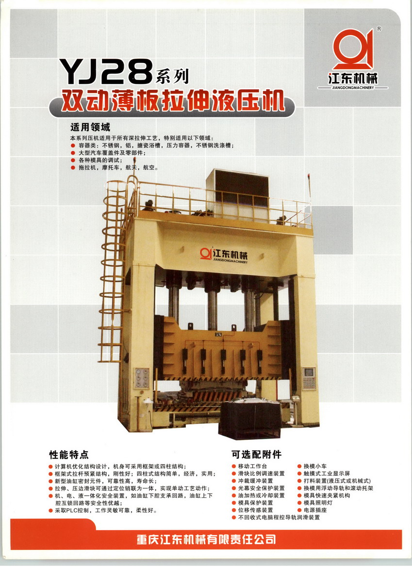 重慶江東機(jī)械有限責(zé)任公司(以下簡稱為江東機(jī)械)通過七十年的發(fā)展,已經(jīng)成為中國西部規(guī)模最大、綜合實(shí)力最強(qiáng)的專業(yè)液壓成形設(shè)備制造企業(yè)。 公司占地458畝,總資產(chǎn)超過3億元,擁有現(xiàn)代化標(biāo)準(zhǔn)廠房7萬余平方米,員工1000余人,擁有各類專業(yè)技術(shù)人員150余人,其中國家級專家2人、市級專家4名、高級工程師6名;在機(jī)械設(shè)計(jì)方面擁有國家級專家1名,市級專家1名,高級工程師2名;在液壓設(shè)計(jì)方面擁有國家級專家1名,市級專家1名,高級工程師2名;電氣設(shè)計(jì)方面擁有市級專家2名,高級工程師2名;另外,江東機(jī)械擁有各類專業(yè)加工設(shè)備200余臺(套),完全具備為用戶提供5000KN-60000KN的各種大型、快速、精密、專用的全自動液壓機(jī)及成套生產(chǎn)線的綜合實(shí)力,月平均制造能力達(dá)到100余臺,年創(chuàng)產(chǎn)值能力達(dá)到4億元以上。公司與機(jī)械科學(xué)研究總院、中國汽車工程研究總院、濟(jì)南鑄鍛研究所、西安重型機(jī)械研究所、上海交通大學(xué)、北京航空航天大學(xué)、華中科技大學(xué)、重慶大學(xué)、重慶理工大學(xué)、中南林業(yè)大學(xué)、重慶機(jī)電研究院等科研院所合作研發(fā),為產(chǎn)品的創(chuàng)新打下堅(jiān)實(shí)基礎(chǔ);在產(chǎn)品中廣泛采用液壓比例伺服控制技術(shù)、位置數(shù)字控制技術(shù)、同步控制技術(shù)、PLC觸摸屏和工控機(jī)控制技術(shù);通過技術(shù)合作和自主開發(fā),我公司已掌握和運(yùn)用當(dāng)今液油壓機(jī)、人造板機(jī)械的最新技術(shù),并鍛煉和造就了一批液油壓機(jī)等產(chǎn)品專業(yè)研究、開發(fā)、設(shè)計(jì)技術(shù)隊(duì)伍,能夠?yàn)閲鴥?nèi)外客戶提供“量體裁衣”的產(chǎn)品,滿足用戶的需求。江東機(jī)械針對用戶個性化的工藝需求已經(jīng)開發(fā)出了20余種、200多個規(guī)格型號的液壓機(jī)產(chǎn)品,被廣泛應(yīng)用于金屬材料的壓制、彎曲、翻邊、擠壓成形及非金屬材料如橡膠、塑料、玻璃鋼、絕緣材料和磨料制品的壓制成形。產(chǎn)品已經(jīng)服務(wù)包括汽車、鐵路、摩托車、五金、家電、建材等眾多行業(yè)領(lǐng)域,產(chǎn)品暢銷全國二十多個省(自治區(qū)),并出口到德國、日本、韓國、埃及等二十多個國家和地區(qū)。