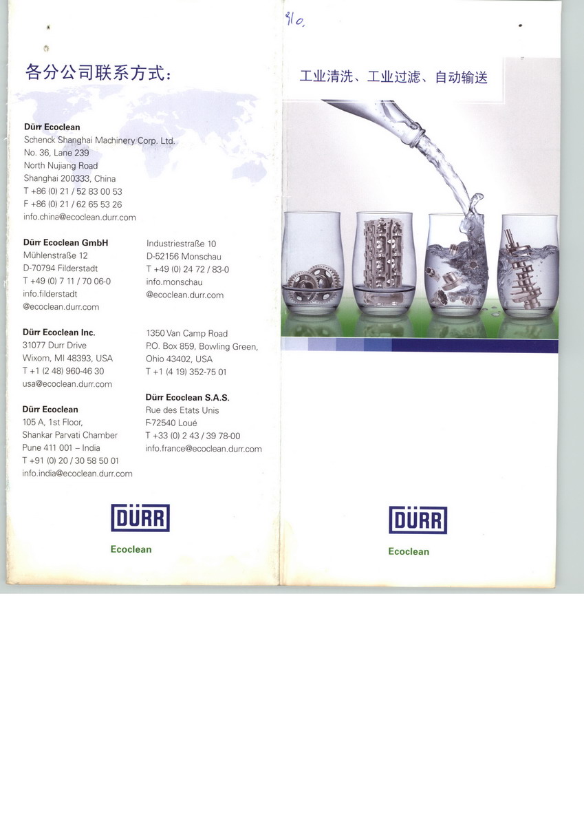 杜爾Ecoclean集團(tuán)是工業(yè)清洗,自動(dòng)傳送和過濾系統(tǒng)領(lǐng)先的解決方案提供者,面對(duì)全球汽車行業(yè)極其他們的配套供應(yīng)商極其更加廣泛的市場(chǎng)提供創(chuàng)新的標(biāo)準(zhǔn)系統(tǒng),客戶訂制的解決方案和服務(wù)。杜爾Ecoclean作為杜爾集團(tuán)的一員,已經(jīng)在德國,法國,捷克,美國,中國和印度擁有自己的工廠和辦事機(jī)構(gòu)。杜爾集團(tuán)活躍在全球市場(chǎng)的供應(yīng)商并在其專業(yè)市場(chǎng)占據(jù)領(lǐng)先位置。汽車行業(yè)的業(yè)務(wù)約占總銷售的85%. 杜爾也為航空航天,工程機(jī)械,化工和制藥行業(yè)提供創(chuàng)新的制造和環(huán)境技術(shù)。杜爾集團(tuán)通過兩個(gè)分支來運(yùn)營管理。涂裝系統(tǒng)主要主要提供生產(chǎn)和噴涂技術(shù),主要應(yīng)用在汽車的車身和汽車汽車底盤生產(chǎn)制造方面。于此同時(shí),測(cè)量和加工系統(tǒng)體為發(fā)動(dòng)機(jī)和傳動(dòng)裝置的生產(chǎn)和車輛的最終裝配服務(wù)。 在全球21個(gè)國家47個(gè)城市分布著杜爾的公司機(jī)構(gòu)。