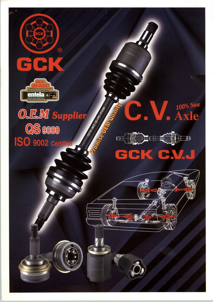Shou Chi Industrial is a professional manufacturer for FWD constant velocity products. Our product categories cover most brands of car makers’ CV Axle and related products globally. Shou Chi has sold auto parts under GCK logo and well-received in all markets over 30 years.Our services cover Axle, Half-shaft, Outer joint, Inner joint, Clamps, Tripod, Center shaft, Cage, Race, ABS ring, CV Boot, Screw Nut, Grease, Chrome ball, and other related process, QC gauges, tooling and audit services.GCK’s manufacturing facilities are certificated by German TUV Sud ISO-9001 and TS-16949. We produce reliable products.GCK products were approved and certificated to supply car markers since 1993. With years of experiences in half-shaft development and mass production, we are a trustworthy partner to many OE car makers in Taiwan, North America and China. With reasonable design optimization, avoiding hazardous material, our products achieved new standard of Weight-Reduction and Eco-Friendly..GCK has State-of-the-art production facility and sophisticated QC equipments, we continue to exchange data with advance National Level testing lab for auto parts related verifications and production information.