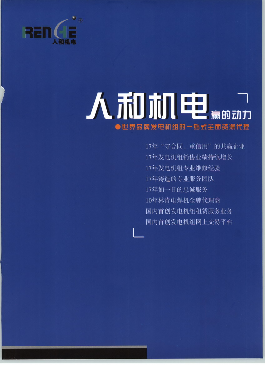人和機(jī)電成立于1988年,是致力于提供世界著名品牌發(fā)電機(jī)組、電焊機(jī)及技術(shù)服務(wù)為主的專業(yè)公司。經(jīng)過(guò)18年的發(fā)展,擁有4個(gè)子公司、4個(gè)辦事處、1個(gè)電子商務(wù)中心,成為集發(fā)電機(jī)組的制造、銷售、租賃及設(shè)備的機(jī)房設(shè)計(jì)、相應(yīng)配套工程、維修服務(wù)與零配件供應(yīng)于一身的同行業(yè)最大的供應(yīng)商之一。北京人和世紀(jì)機(jī)電設(shè)備有限公司,主要經(jīng)營(yíng)人和/康明斯系列柴油發(fā)電機(jī)組;人和/大宇系列柴油發(fā)電機(jī)組;人和/富豪系列柴油發(fā)電機(jī)組,公司注冊(cè)資本未知,我公司的辦公地址位于中國(guó)的首都,政治、文化中心北京,中國(guó) 北京 北京市 朝陽(yáng)區(qū)東三環(huán)北路3號(hào)幸福大廈A座1205室,我們有最好的產(chǎn)品和專業(yè)的銷售和技術(shù)團(tuán)隊(duì),我們?yōu)榭蛻籼峁┳詈玫漠a(chǎn)品、良好的技術(shù)支持、健全的售后服務(wù),北京人和世紀(jì)機(jī)電設(shè)備有限公司是北京柴油發(fā)電機(jī)組行業(yè)知名企業(yè),如果您對(duì)我公司的產(chǎn)品服務(wù)有興趣,請(qǐng)?jiān)诰€留言或者來(lái)電咨詢。