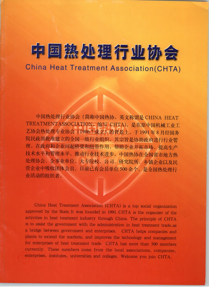 中國熱處理行業(yè)協(xié)會(簡稱中國熱協(xié),英文稱謂是CHINA HEAT TREATMENT ASSOCIATION,縮寫CHTA),是在原中國機械工業(yè)工藝協(xié)會熱處理專業(yè)協(xié)會(1986.7成立)的北景上,于1991年8月經(jīng)國務(wù)院民政部批準(zhǔn)建立的全國一級行業(yè)組織。其宗旨是協(xié)助政府進(jìn)行行業(yè)管理,在政府和企業(yè)間起橋梁和紐帶作用,幫助企業(yè)開拓市場、提高生產(chǎn)技術(shù)水平和管理水平,推動行業(yè)技術(shù)進(jìn)步。中國熱協(xié)在全國省市地方熱處理協(xié)會、企事業(yè)單位、大專院校、公司、研究院所、鄉(xiāng)鎮(zhèn)企業(yè)以及民營企業(yè)中吸收團體會員,目前已有會員單位近1000余個,是全國熱處理行業(yè)活動的組織者。