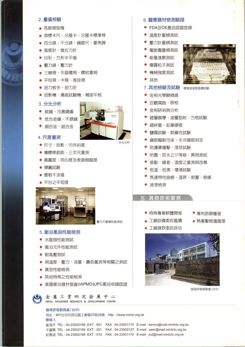 金屬工業(yè)研究發(fā)展中心簡稱金屬中心,成立于民國五十二年,是唯一將總部設(shè)在南部,由經(jīng)濟(jì)部監(jiān)督之財(cái)團(tuán)法人研究單位,目前總?cè)藬?shù)約700人,擁有博士學(xué)位者約52人,碩士學(xué)位者約361人。除了執(zhí)行長室、企劃推廣處、育成中心與工業(yè)安全衛(wèi)生室之外,下分六個(gè)研究業(yè)務(wù)處:金屬製程研發(fā)處、能源與精敏系統(tǒng)設(shè)備處、精微成形研發(fā)處、醫(yī)療器材及光電設(shè)備處、產(chǎn)業(yè)升級(jí)服務(wù)處、區(qū)域研發(fā)服務(wù)處(臺(tái)北及臺(tái)中)。