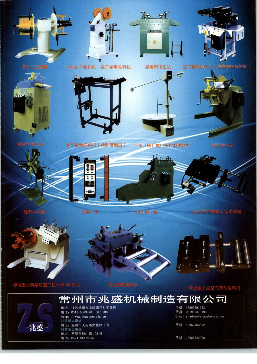 常州市兆盛機械制造有限公司位于中國美麗富饒,高科技產(chǎn)業(yè)群集的長江三角洲區(qū)域-龍城常州。本公司專業(yè)生產(chǎn)沖床周邊設(shè)備,專業(yè)制造與銷售沖床周邊自動化系列設(shè)備,包括伺服左右偏擺送料機和NCF滾輪送料機,空氣送料機,高速滾筒送料機,平面電子控制送料機,端子收料機,NC滾輪送料機,料架矯正機,精密矯正機,微電腦下死點檢出器,磨具安全檢出裝置,光電護手,高速沖床隔音箱及NC電腦精密整平送料機等。產(chǎn)品行銷全國各地,并受到客戶廣泛的肯定與認同。