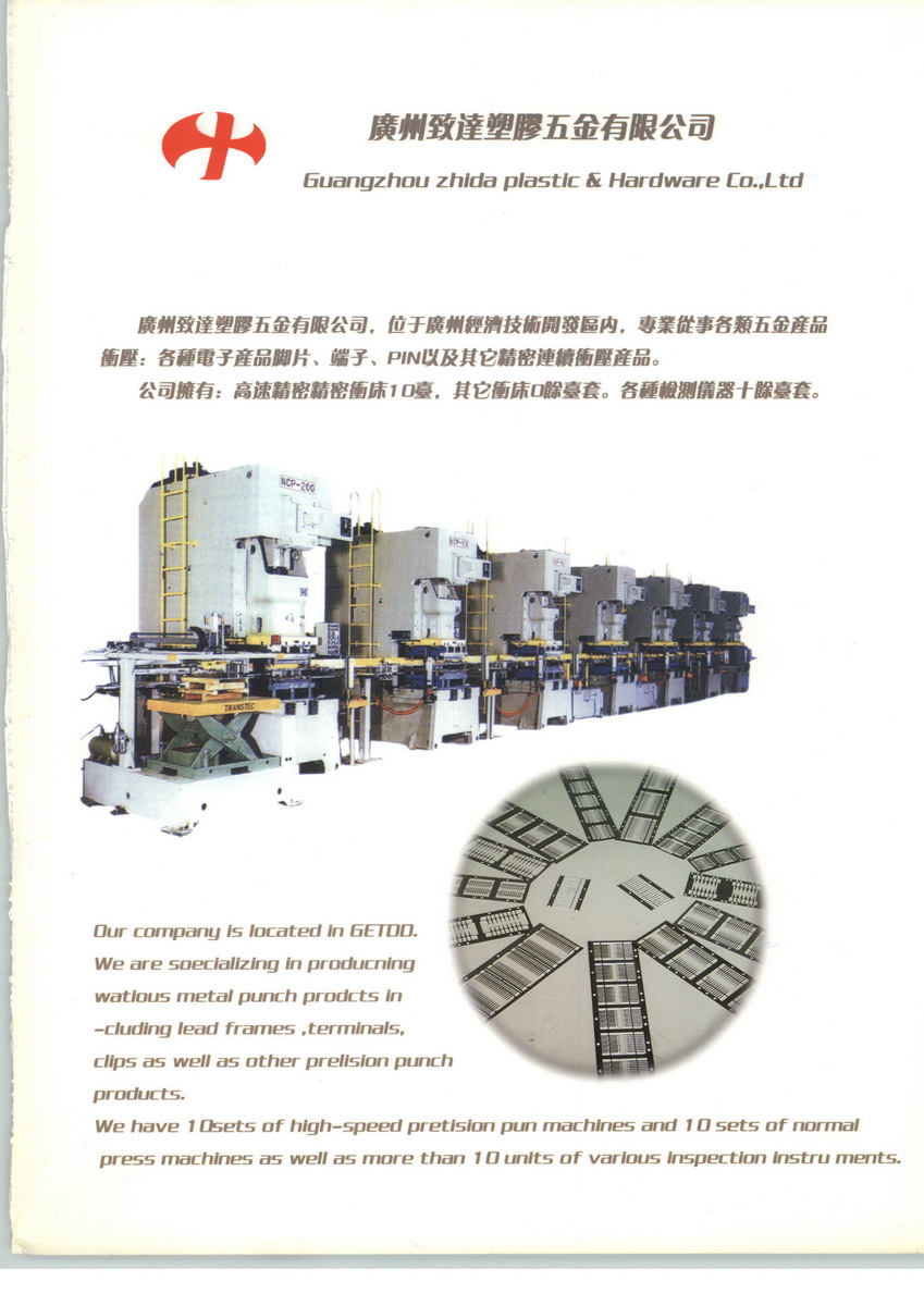 廣州致達(dá)集團(tuán)位于廣州經(jīng)濟(jì)技術(shù)開發(fā)區(qū)內(nèi),公司擁有:廣州致達(dá)塑膠五金有限公司,致達(dá)(德陽)精密電子有限公司,廣州黃海精密模具有限公司。公司主要產(chǎn)品:大功率LED支架、模條、透鏡;網(wǎng)絡(luò)電子變壓器底座、支架;各種精密沖壓、注塑模具。廣州市區(qū)高新技術(shù)企業(yè)(廣州黃海精密模具有限公司)公司大事記:1994年:成立專業(yè)生產(chǎn)精密模具為主的廣州黃海精密模具有限公司,從事電子分離器件的塑封、切斷等模具的設(shè)計(jì)、生產(chǎn)制造。2000年:進(jìn)入網(wǎng)絡(luò)電子變壓器模具行業(yè),為眾多網(wǎng)絡(luò)電子變壓器提供相關(guān)封裝和打彎切斷模具。2003年:成立廣州致達(dá)塑膠五金有限公司,從事各類精密五金沖壓件、精密塑膠件的生產(chǎn)加工,初期主要生產(chǎn)各類網(wǎng)絡(luò)電子變壓器用框架和外殼。 2005年:開始生產(chǎn)大功率LED支架。2006年:開始研發(fā)半導(dǎo)體產(chǎn)品用Lead frame,同年成功自行生產(chǎn)出SOT-23用Lead frame。2007年:為了配合公司未來發(fā)展,公司在四川德陽投資的“致達(dá)(德陽)精密電子有限公司”開始進(jìn)入正式運(yùn)做,當(dāng)年年底投如了生產(chǎn)。2010年,致達(dá)(德陽)精密電子有限公司新廠房如期投入使用,致達(dá)集團(tuán)的發(fā)展進(jìn)入了一個(gè)新的平臺(tái)。未來目標(biāo):未來公司將為發(fā)展成為中國(guó)精密沖壓及注塑行業(yè)中標(biāo)志性企業(yè)而努力。