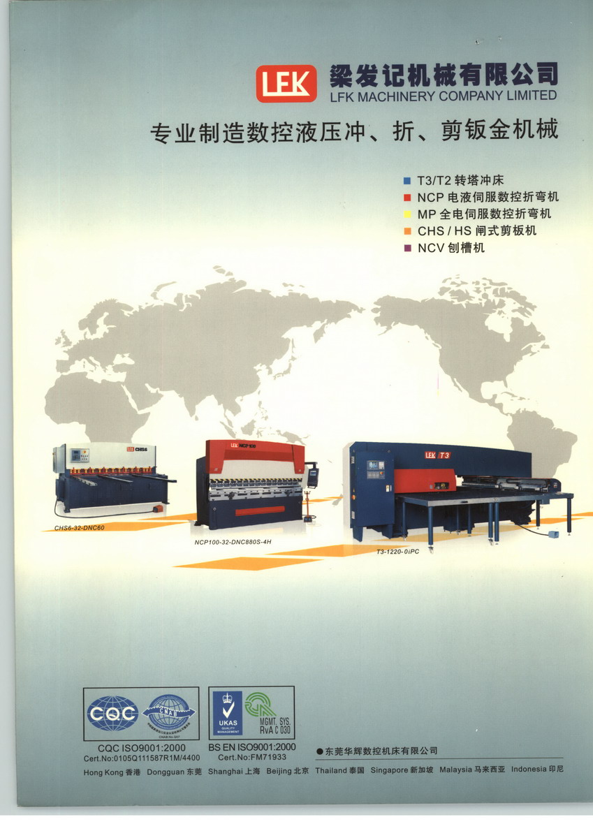 LFK香港梁發(fā)記機械集團公司其下3間下屬公司,已發(fā)展成為集科研、開發(fā)、生產(chǎn)、銷售以及服務于一體的高新科技企業(yè)。1992年自置30000平方米廠房,成立了東莞華輝數(shù)控機床有限公司,在位于交通便利的廣東省東莞市清溪鎮(zhèn)。2008年2月自置70000多平方米廠房,成立了信宜華輝數(shù)控機床有限公司。2014年11月自置10000多平方米廠房,成立了信宜協(xié)華精密鈑金有限公司?,F(xiàn)共有600多名人員。在管理方面采用全電腦的管理體系。具有先進的技術、優(yōu)良的品質(zhì)、優(yōu)質(zhì)的服務、贏得了廣大客戶的贊譽。