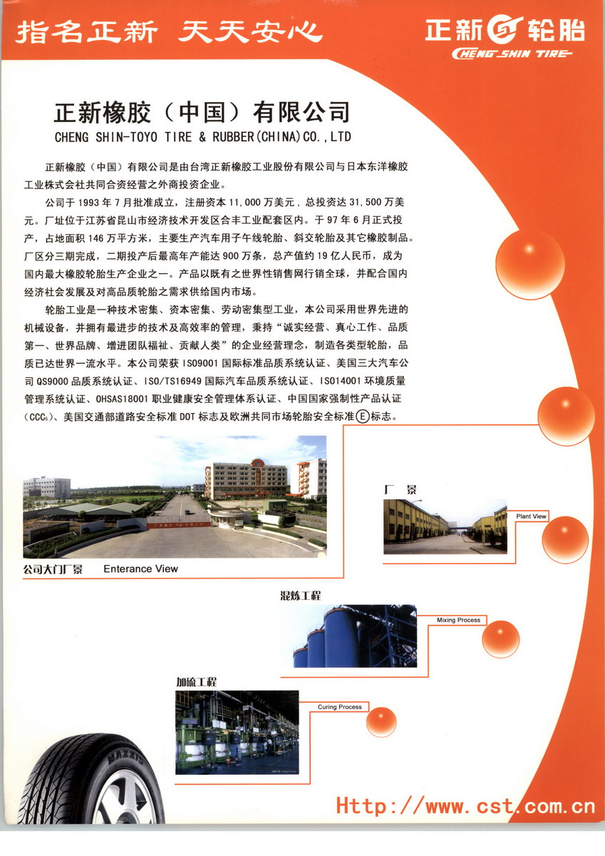 廈門正新橡膠工業(yè)有限公司,成立于1989年5月,為正新廈門集團(tuán)總公司。正新輪胎創(chuàng)建于臺(tái)灣,自1967年迄今,正新集團(tuán)已發(fā)展成為全球第九大輪胎制造商,也是同行業(yè)中發(fā)展速度最快的輪胎生產(chǎn)商之一。以誠(chéng)實(shí)經(jīng)營(yíng)、品質(zhì)第一的經(jīng)營(yíng)理念營(yíng)銷全球。截止目前,正新在全球一共有5個(gè)研發(fā)中心并擁有17座生產(chǎn)基地,橫跨五大洲,總員工人數(shù)超過20000人,銷售網(wǎng)絡(luò)遍布140多個(gè)國(guó)家。