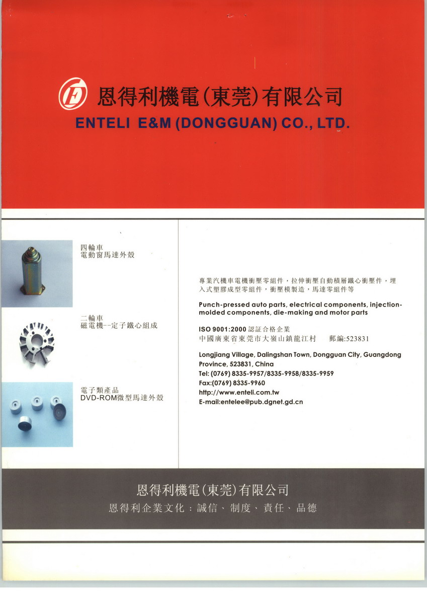 恩得利機(jī)電(東莞)有限公司,主要經(jīng)營(yíng)生產(chǎn)和銷售電磁起動(dòng)器、馬達(dá)、馬達(dá)零配件、沖壓模具、注塑模具、機(jī)電塑膠五金零部件;產(chǎn)品內(nèi)外銷比例按批文執(zhí)行,于2001年7月4日在東莞工商局登記注冊(cè),業(yè)務(wù)經(jīng)理是葉牡丹,公司注冊(cè)資本710(萬(wàn)元),我公司的辦公地址位于珠江口東岸,廣東歷史文化名城東莞,廣東 東莞 大嶺山鎮(zhèn)居民委員會(huì)龍江村,在職員工80名,我們有最好的產(chǎn)品和專業(yè)的銷售和技術(shù)團(tuán)隊(duì),在公司發(fā)展壯大的15年里,我們?yōu)榭蛻籼峁┳詈玫漠a(chǎn)品、良好的技術(shù)支持、健全的售后服務(wù),恩得利機(jī)電(東莞)有限公司是東莞電機(jī)廠行業(yè)知名企業(yè),如果您對(duì)我公司的產(chǎn)品服務(wù)有興趣,請(qǐng)?jiān)诰€留言或者來(lái)電咨詢。