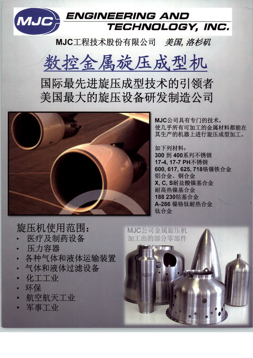 MJC 工程技術(shù)股份有限公司是世界發(fā)展和制造數(shù)控金屬無切削旋壓設(shè)備的領(lǐng)導(dǎo)者,是美國最大的旋壓設(shè)備研發(fā)制造公司,公司設(shè)計和制造的數(shù)百臺數(shù)控金屬旋壓成型機器設(shè)備被廣泛地應(yīng)用在航空航天,國防軍事工業(yè),商業(yè)和傳統(tǒng)工業(yè),壓力容器, 醫(yī)療及制藥設(shè)備,各種氣體和液體運輸裝置,氣體和液體過濾設(shè)備,石油化工工業(yè),等領(lǐng)域以生產(chǎn)各種用途的零部件。在世界各地,我們按照用戶的要求來設(shè)計和制造的數(shù)百臺具備特殊功能的各種金屬旋壓成型機器設(shè)備是無縫壓力容器制造商的第一選擇。
