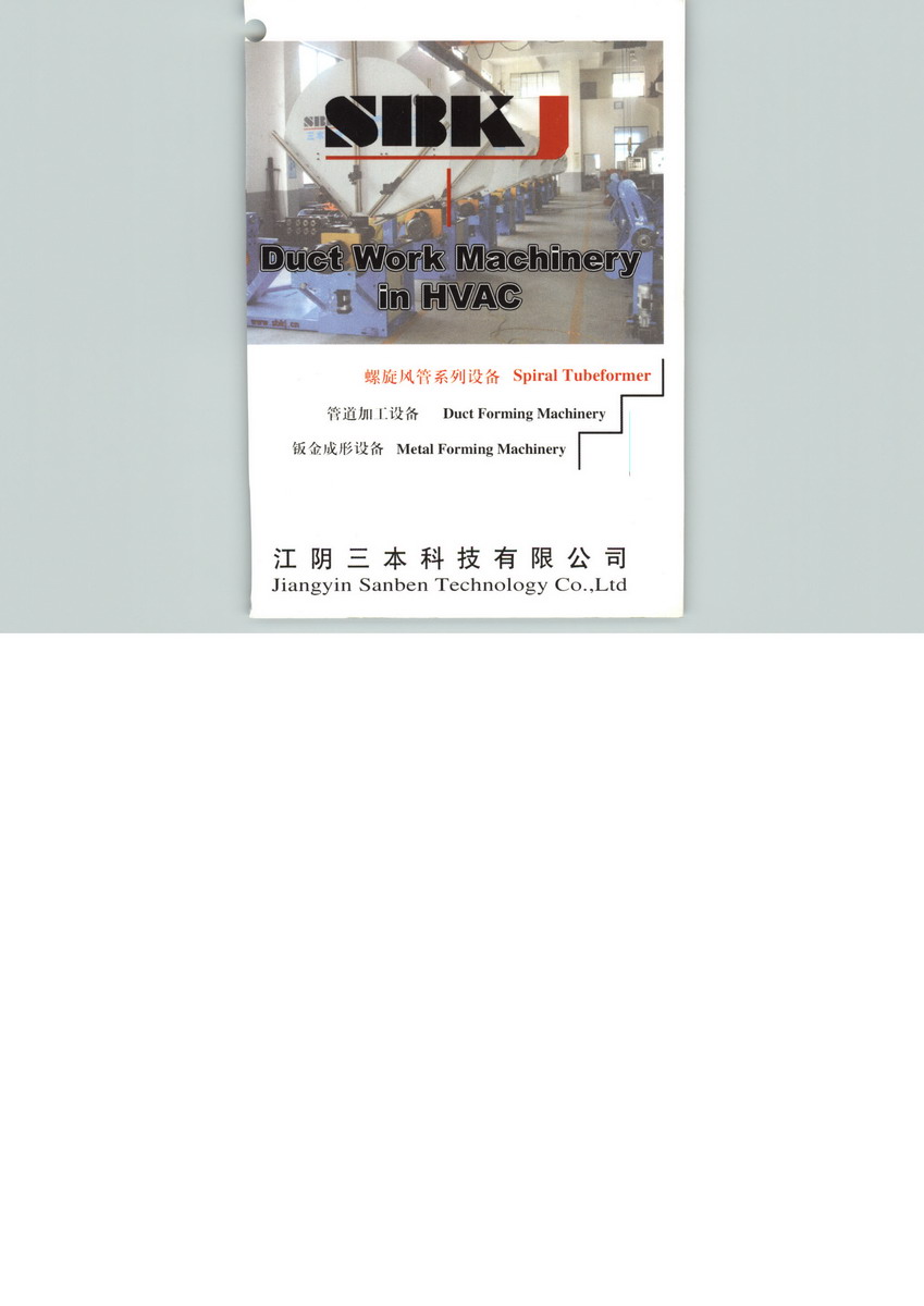 江陰三本科技有限公司專業(yè)研發(fā)生產(chǎn)通風(fēng)管道設(shè)備,鈑金成型機(jī)械。目前公司已成功開發(fā)了螺旋圓風(fēng)管設(shè)備系列產(chǎn)品及方管制作系列產(chǎn)品,主打產(chǎn)品有螺旋圓風(fēng)管機(jī),除塵風(fēng)管成型機(jī),螺旋風(fēng)管機(jī),預(yù)應(yīng)力波紋管機(jī),滾剪式螺旋風(fēng)管機(jī),飛剪式螺旋風(fēng)管機(jī),橢圓風(fēng)管機(jī),鋁箔軟管機(jī),鋁箔風(fēng)管機(jī),雙層鋁箔軟管機(jī);蝦米彎頭機(jī),液壓蝦米彎頭機(jī),轆線機(jī),轆線壓筋機(jī);圓法蘭成型機(jī),等離子切割機(jī),點(diǎn)焊機(jī),經(jīng)濟(jì)型縫焊機(jī),綴縫焊機(jī),無鉚釘連接機(jī);共板法蘭機(jī),插接式法蘭機(jī),全自動(dòng)生產(chǎn)線,咬口機(jī),聯(lián)合角咬口機(jī),按扣式咬口機(jī);腳踏/電動(dòng)剪板機(jī),手動(dòng)/電動(dòng)卷板機(jī),折邊機(jī),液壓折邊機(jī),電動(dòng)剪圓機(jī),壓筋機(jī),校平機(jī),腳踏剪角機(jī),分條機(jī);卷板機(jī)。公司運(yùn)用CAD/CAM、機(jī)電一體化技術(shù),兢兢業(yè)業(yè)致力于新產(chǎn)品、新工藝、新技術(shù)的研究開發(fā),以優(yōu)質(zhì)的產(chǎn)品、合理的價(jià)格、及時(shí)的交貨時(shí)間為經(jīng)營(yíng)原則,本著“誠(chéng)信為本、科技為本、人文為本”的企業(yè)精神,忠誠(chéng)服務(wù)好國(guó)內(nèi)外的每一位用戶!歡迎國(guó)內(nèi)外朋友垂詢與合作!