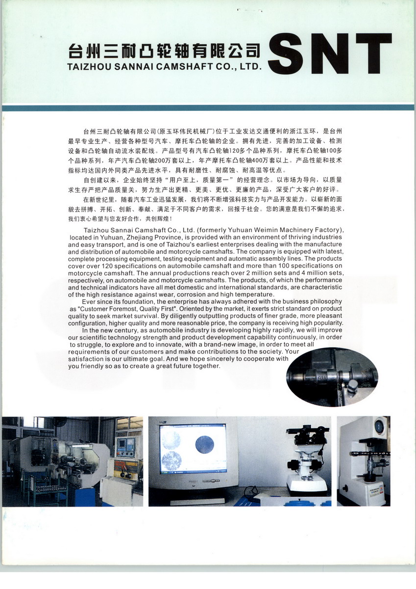 臺州三耐凸輪軸有限公司(原玉環(huán)偉民機(jī)械廠)位于工業(yè)發(fā)達(dá)交通便利的浙江玉環(huán),是臺州最早專業(yè)生產(chǎn)、經(jīng)營各種型號汽車、摩托車凸輪軸的 企業(yè)。擁有先進(jìn),完善的加工設(shè)備、檢測設(shè)備和凸輪軸自動流水裝配線。產(chǎn)品型號有汽車凸輪軸120多個品種系列,摩托車凸輪軸100多個品種系列,年產(chǎn)汽車凸輪軸200萬套以上,年產(chǎn)摩托車凸輪軸400萬套以上。產(chǎn)品性能和技術(shù)指標(biāo)均達(dá)國內(nèi)外同類產(chǎn)品先進(jìn)水平,具有耐磨性、耐腐蝕、耐高溫等優(yōu)點。