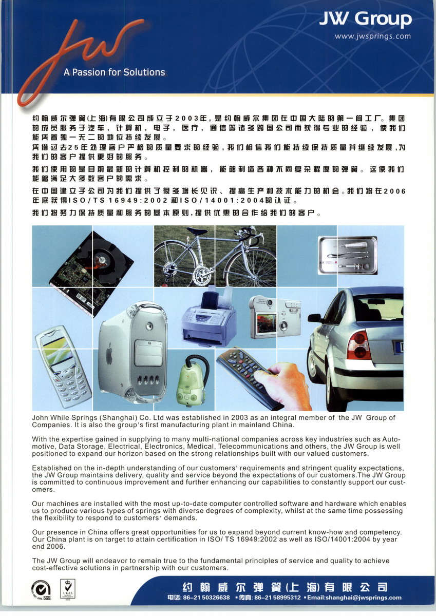 在彈簧制造方面我們有很長的歷史。我們的父母最早于1885年在澳大利亞創(chuàng)辦彈簧工廠?,F(xiàn)在的約翰威爾集團成立于1979年,經(jīng)過30年的發(fā)展壯大公司已經(jīng)囊括上海浦東;春武里省,泰國和新加坡的更多制造廠址。經(jīng)過擴張現(xiàn)在已經(jīng)開始生產(chǎn)滿足醫(yī)療和洗車領(lǐng)域的彈簧。