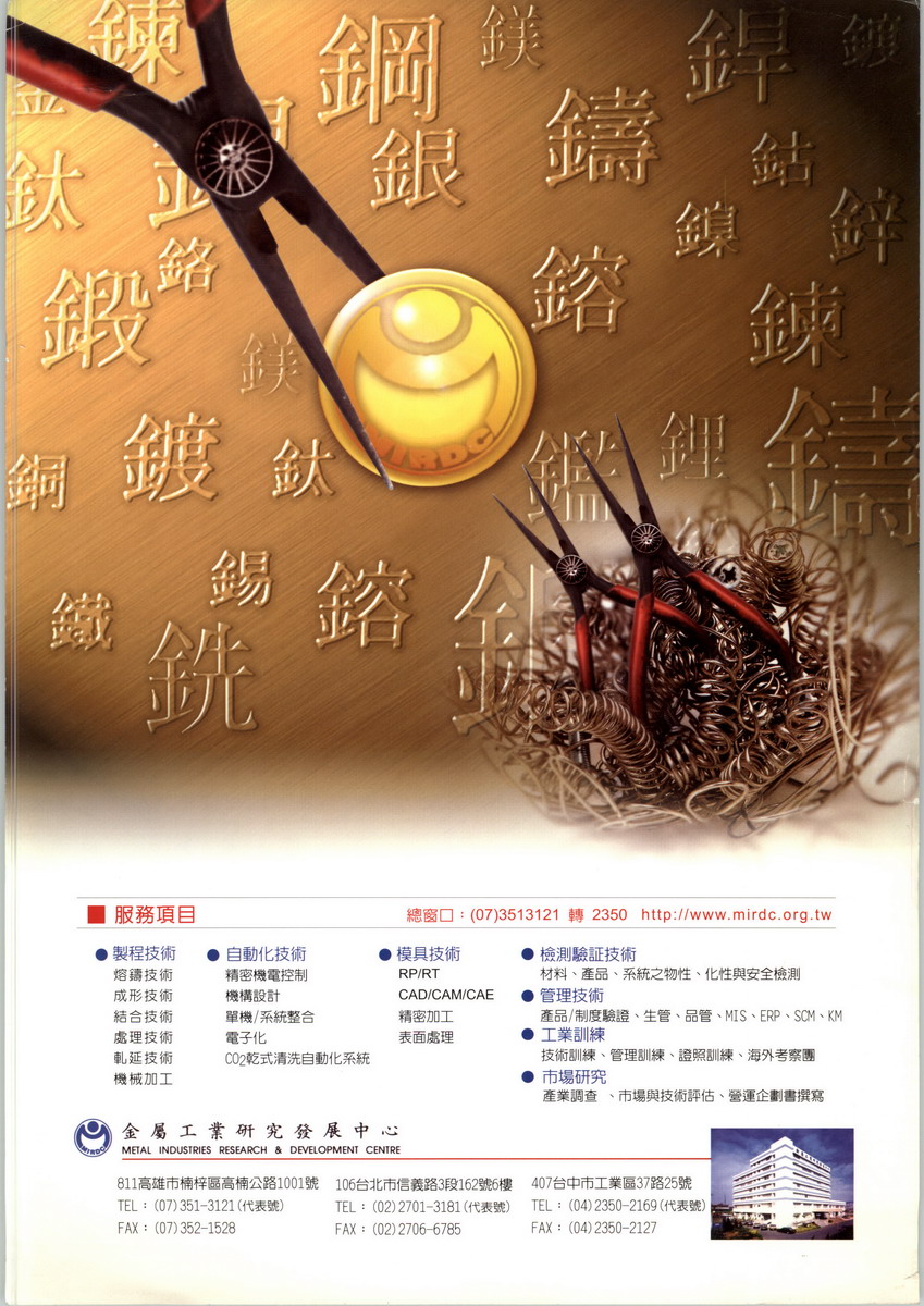 民國五十二年十月,我國政府與聯(lián)合國特別基金會及國際勞工局會同訂立「金屬工業(yè)發(fā)展計畫」於高雄市成立財團法人金屬工業(yè)發(fā)展中心。五年後該計畫圓滿完成,乃於五十七年十月移交給我政府繼續(xù)運作,以促進我國金屬工業(yè)之成長與發(fā)展。本中心為加強研發(fā)技術(shù),特於八十二年五月起,更名為金屬工業(yè)研究發(fā)展中心。金屬工業(yè)研究發(fā)展中心為非營利性財團法人,從事金屬及其相關(guān)工業(yè)所需生產(chǎn)與管理技術(shù)之研究發(fā)展與推廣。旨在促進國內(nèi)金屬及其相關(guān)工業(yè)升級,使其具備國際市場良好之競爭能力。