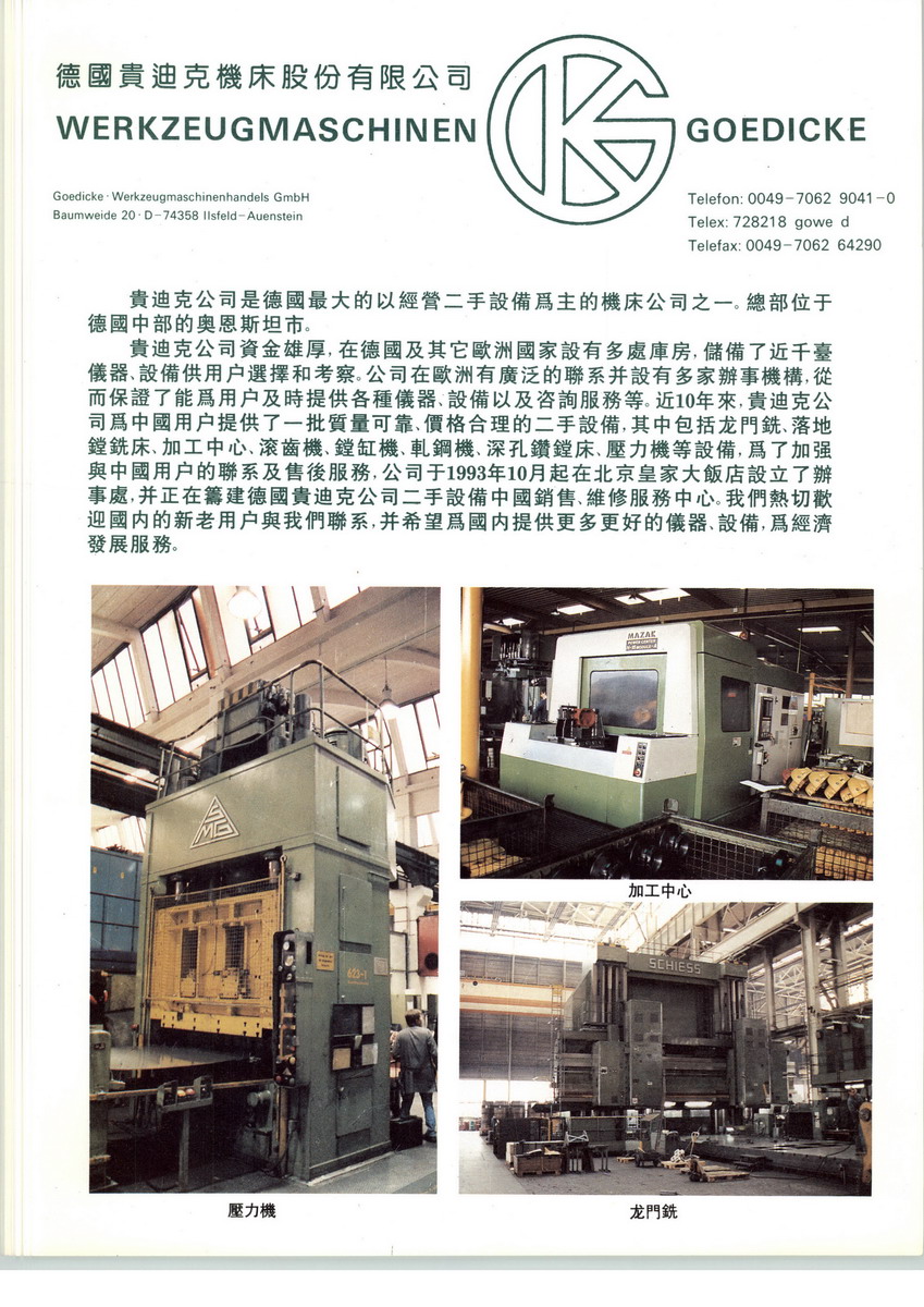 德國(guó)貴迪克機(jī)床貿(mào)易有限公司是一家二手金屬切削和成型設(shè)備的專業(yè)公司。我們盡可能擴(kuò)大我們的供貨范圍。從我們這里,您既能獲得普通機(jī)床,也能獲得數(shù)控機(jī)床。我們也很愿意為您提供特殊的和專用的機(jī)床。我最重視的是向客戶提供能夠正常使用的二手設(shè)備。相對(duì)新機(jī)床我們的二手設(shè)備可以更快地投入使用,而且具有價(jià)格優(yōu)勢(shì)。同時(shí)在精度上和功能上無需擔(dān)心。45年來我們?cè)谶@個(gè)領(lǐng)域致力于向客戶提供令用戶滿意的設(shè)備、全面的生產(chǎn)咨詢、項(xiàng)目策劃、設(shè)備維修和安裝調(diào)試等服務(wù)。