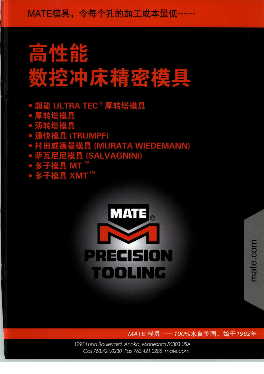 美國MATE模具公司成立于1962年。總部位于美國明尼蘇達州,阿諾卡(ANOKA),靠近五大湖區(qū)。工廠建筑面積為大約30,000多平方米,共有五百多名員工,年銷售額超過80,000,000.00美元。數(shù)控沖床模具是我們唯一的業(yè)務(wù)。另外,我們在德國,英國建有分支工廠,在馬來西亞,瑞典,中國設(shè)有銷售代表處,在全球65個國家有代理商。公司有一大批專業(yè)工程師為客戶提供高質(zhì)量的技術(shù)服務(wù)。