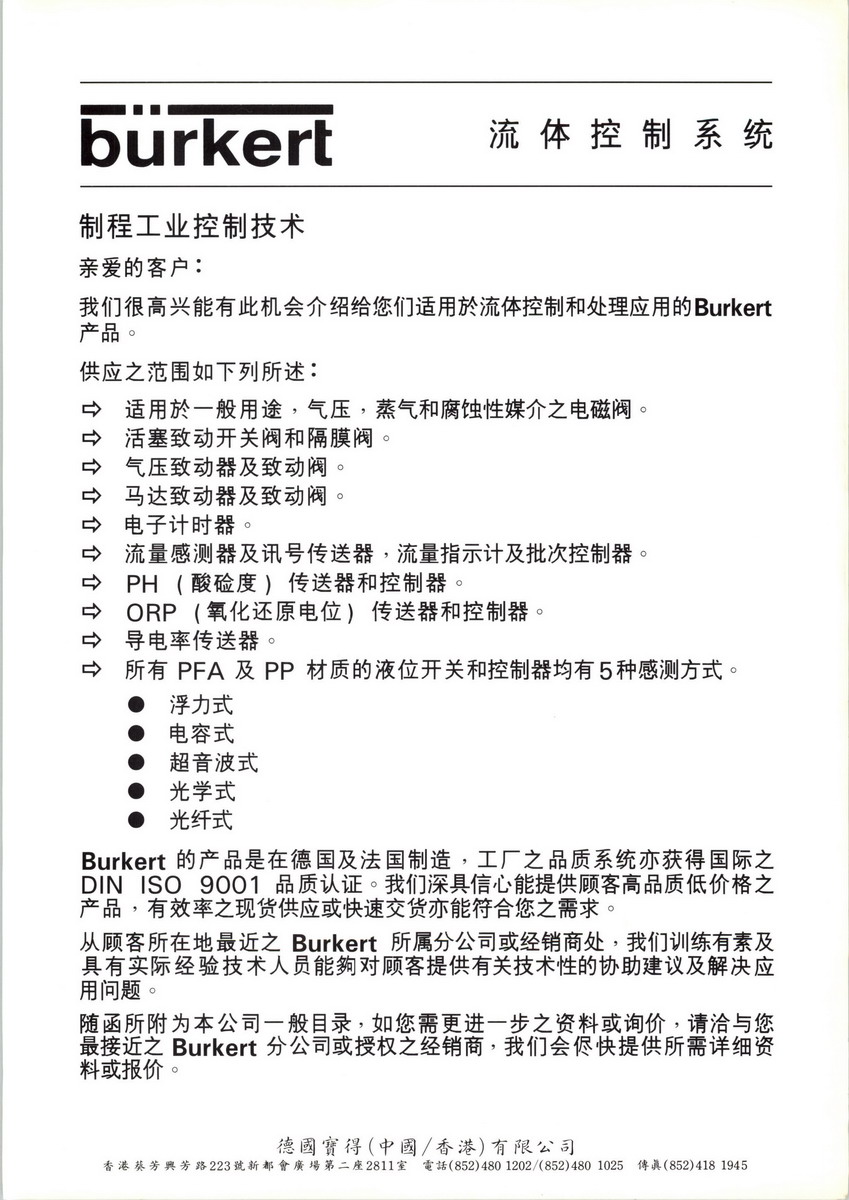 德國寶德burkert公司的一個品牌,專業(yè)從事過程產(chǎn)品,如電磁閥,蝶閥,球閥,角座閥,止回閥,過濾器,氣動驅(qū)動,傳感器和控制器等生產(chǎn)銷售。目前在全世界有4個研發(fā)中心5個生產(chǎn)地點35附屬公司,3000多員工(至2013年)。我們提供全球性的經(jīng)驗,你可以依靠。寶得是一個適應(yīng)性強的組織,靈活的流程。我們不斷致力于取得成功,既為我們的客戶和我們自己。一致和持續(xù)的研發(fā)和員工培訓(xùn)的投資,使我們能夠為客戶提供最好的技術(shù)和服務(wù)。提出任何要求或目標(biāo),你可能有流體過程控制,寶得可以依靠和你一起工作,我們會發(fā)現(xiàn)最好的解決方案,無論從技術(shù)和經(jīng)濟的角度來看。寶得增長,銷售在國外的活動已經(jīng)展開,越來越多的附屬公司在主要的工業(yè)化國家的支持。我們的全球存在,使我們能夠?qū)W⒂谔囟ㄊ袌鲎铌P(guān)切的問題,同時為客戶提供最有效的解決方案,在他們的國家。六十多年來,德國寶德burkert公司一直致力于流體控制領(lǐng)域的產(chǎn)品和系統(tǒng)的研發(fā)、制造。如今德國寶德burkert公司已發(fā)展成一個擁有三千多名員工、在德國,法國及中國擁有五家生產(chǎn)廠。在全球四十多個國家和地區(qū)設(shè)立了分公司的跨國集團,成為流體控制系統(tǒng)領(lǐng)域的全球領(lǐng)先者。德國寶德burkert公司在長期的發(fā)展過程中,非常重視技術(shù)創(chuàng)新和新品開發(fā)。通過針對性的產(chǎn)品設(shè)計、現(xiàn)代化和加工工藝、嚴(yán)格認真的質(zhì)量檢驗和切實的市場預(yù)測,形成了以“通用電磁閥系統(tǒng)”“過程控制閥系統(tǒng)”“氣動控制閥系統(tǒng)”“液體分析閥系統(tǒng)”以及“傳感器/變送器”和 “控制器”為主體的六大系列產(chǎn)品?;凇癇urkert”產(chǎn)品精巧的設(shè)計、卓越的性能和完善的服務(wù),使“Burkert”產(chǎn)品在流 體控制領(lǐng)域始終處于領(lǐng)先地位。 “Burkert”生產(chǎn)的 “環(huán)氧樹脂封裝線圈”以及“電纜連接插頭 ”已成為國際ISO質(zhì)量標(biāo)準(zhǔn)。德國寶德burkert公司發(fā)明的 “先導(dǎo)銜鐵電磁系統(tǒng)”“搖臂式電磁閥”及“脈沖 線圈”就是公司不斷創(chuàng)新發(fā)展的最佳例證。目前,Burkert專業(yè)化的流體控制系統(tǒng)產(chǎn)品已廣泛應(yīng)用于各行各業(yè),尤其在水/污水處理、啤酒飲 料、食品加工、制藥及醫(yī)療設(shè)備、消毒清洗、及紡織化工等領(lǐng)域更是有著極大的優(yōu)勢和廣闊的市場前 景。而且在一些極端苛刻的工作情況下,如衛(wèi)星、太空試驗室、核反應(yīng)堆及深海探測裝中,“Burkert”產(chǎn)品也顯示了其精確性和可靠性. 隨著中國工業(yè)的不斷發(fā)展,德國寶德burkert公司將以其先進的產(chǎn)品、優(yōu)良的品質(zhì)、周到的服務(wù)致力于中國工業(yè)化水平的進一步提高,同時組建了香港、上海、成都、蘇州、北京、廣州辦事處。以此為依托為廣大客戶更加及時準(zhǔn)確地供貨,提供相應(yīng)的技術(shù)服務(wù)和培訓(xùn),并針對客戶的應(yīng)用要求提供最專業(yè)、最周到的服務(wù)。